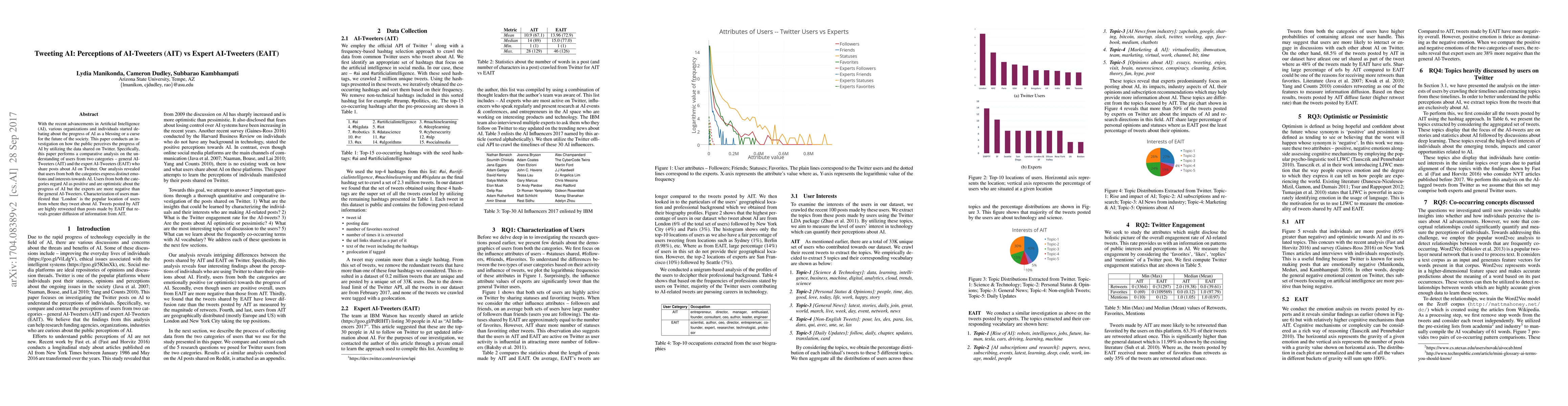 A study on Twitter users' perceptions of AI found that general AI-Tweeters and expert AI-Tweeters hold similar optimistic views, but experts express greater negativity towards AI, with AIT having more retweeted posts.