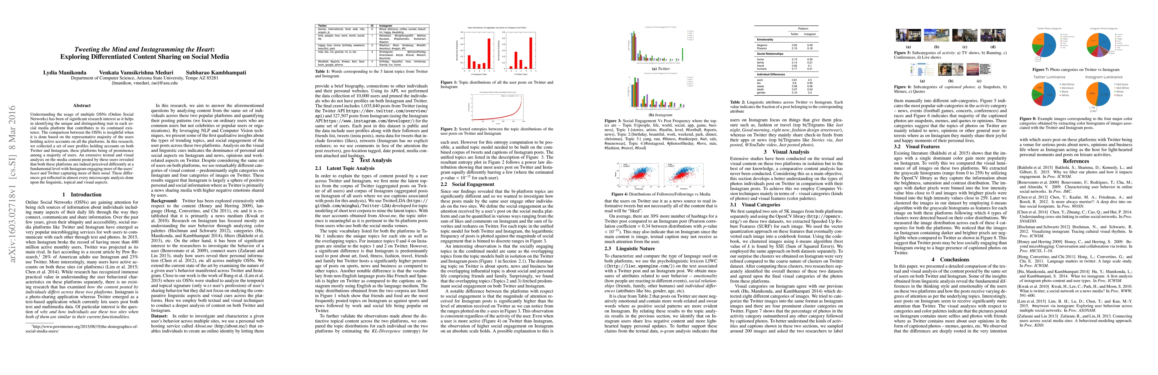 This research investigates differentiated content sharing between Twitter and Instagram, revealing that Instagram appeals more to users' emotions while Twitter engages their intellect, as evidenced by linguistic, topical, and visual analyses of user-generated content.