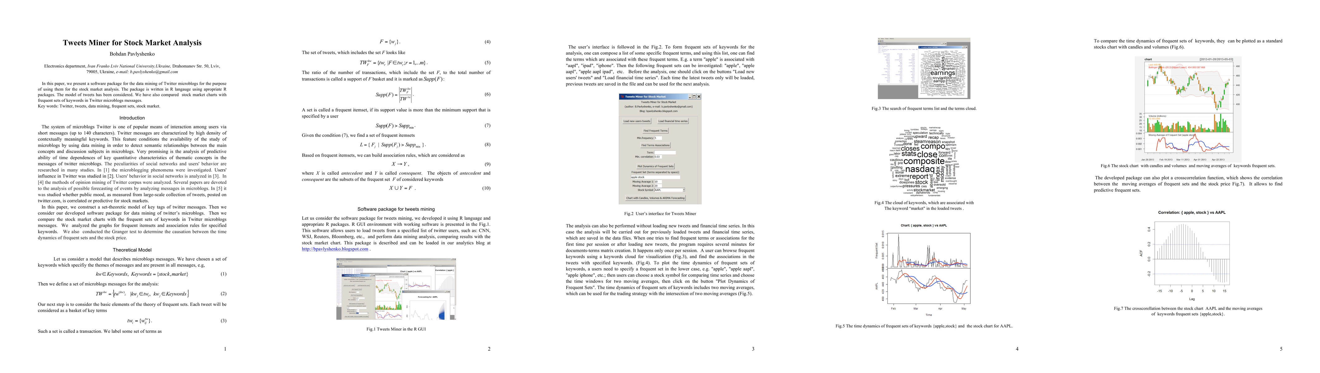 Summary: This paper introduces an R-based software package for mining Twitter microblogs to analyze stock market trends, comparing stock charts with frequent keyword sets from tweets to identify potential market influences.