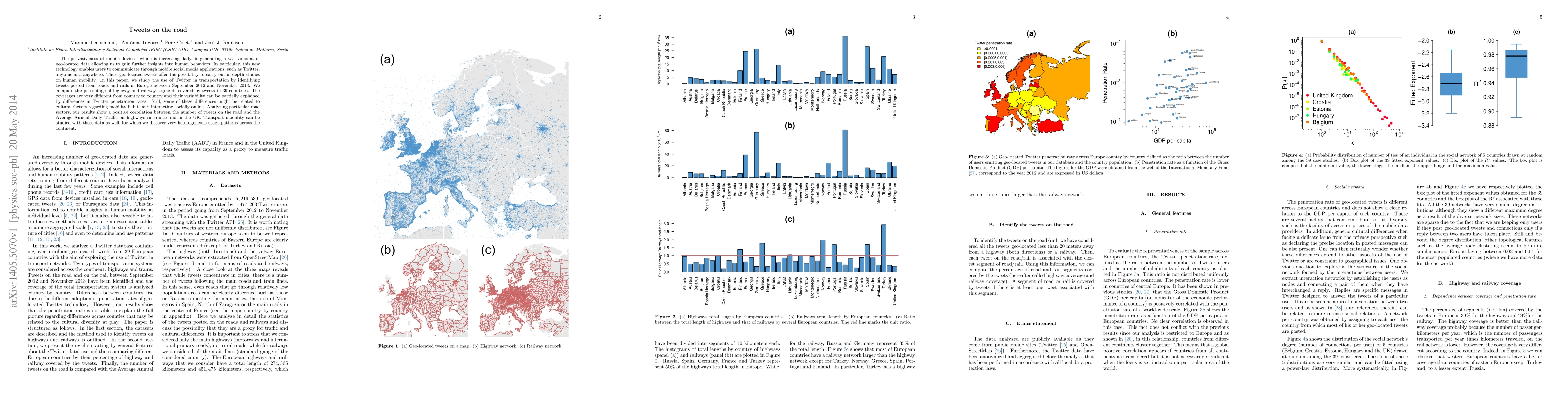 The pervasiveness of mobile devices, which is increasing daily, is generating a vast amount of geo-located data allowing us to gain further insights into human behaviors. In particular, this new technology enables users to communicate through mobile social media applications, such as Twitter, anytime and anywhere. Thus, geo-located tweets offer the possibility to carry out in-depth studies on human mobility. In this paper, we study the use of Twitter in transportation by identifying tweets posted from roads and rails in Europe between September 2012 and November 2013. We compute the percentage of highway and railway segments covered by tweets in 39 countries. The coverages are very different from country to country and their variability can be partially explained by differences in Twitter penetration rates. Still, some of these differences might be related to cultural factors regarding mobility habits and interacting socially online. Analyzing particular road sectors, our results show a positive correlation between the number of tweets on the road and the Average Annual Daily Traffic on highways in France and in the UK. Transport modality can be studied with these data as well, for which we discover very heterogeneous usage patterns across the continent.