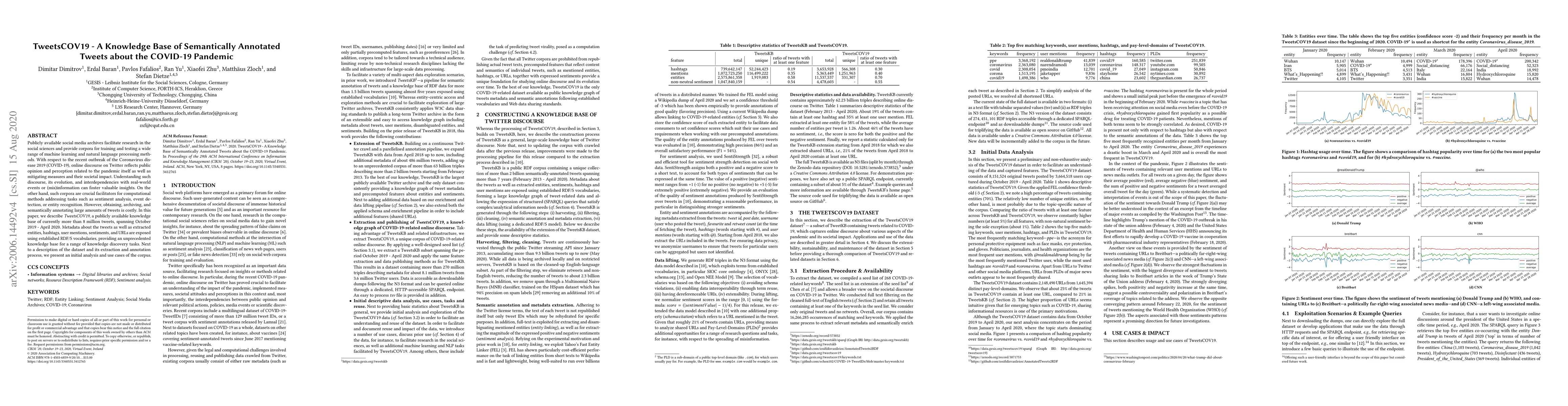 Publicly available social media archives facilitate research in the social sciences and provide corpora for training and testing a wide range of machine learning and natural language processing methods. With respect to the recent outbreak of the Coronavirus disease 2019 (COVID-19), online discourse on Twitter reflects public opinion and perception related to the pandemic itself as well as mitigating measures and their societal impact. Understanding such discourse, its evolution, and interdependencies with real-world events or (mis)information can foster valuable insights. On the other hand, such corpora are crucial facilitators for computational methods addressing tasks such as sentiment analysis, event detection, or entity recognition. However, obtaining, archiving, and semantically annotating large amounts of tweets is costly. In this paper, we describe TweetsCOV19, a publicly available knowledge base of currently more than 8 million tweets, spanning October 2019 - April 2020. Metadata about the tweets as well as extracted entities, hashtags, user mentions, sentiments, and URLs are exposed using established RDF/S vocabularies, providing an unprecedented knowledge base for a range of knowledge discovery tasks. Next to a description of the dataset and its extraction and annotation process, we present an initial analysis and use cases of the corpus.