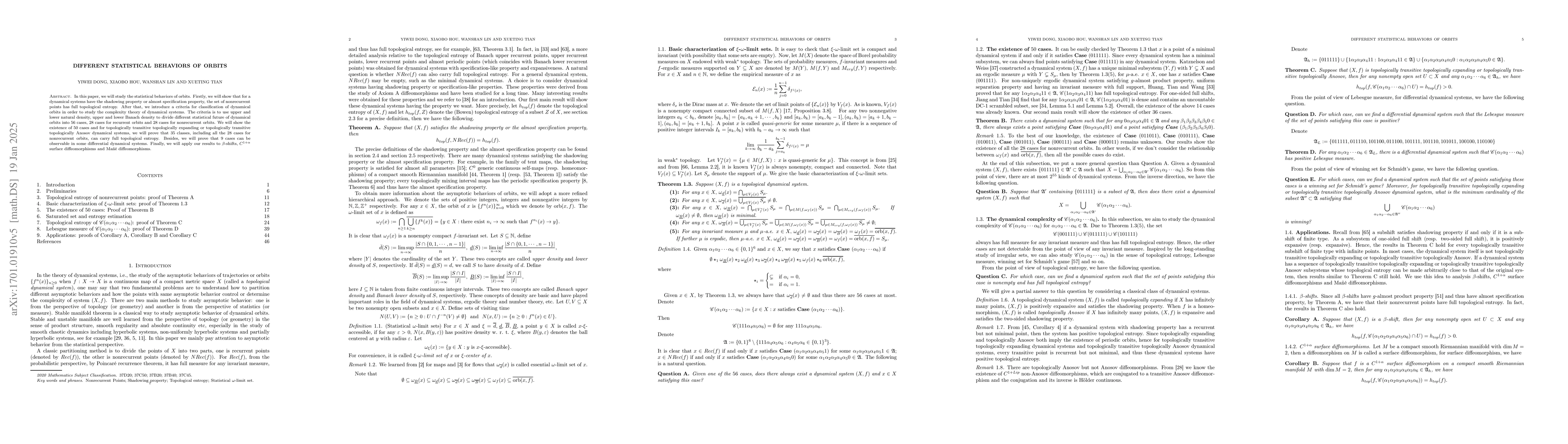 This paper introduces a new classification criteria for dynamical orbits based on upper and lower natural and Banach densities, revealing twelve distinct orbit structures in hyperbolic systems with high topological entropy. It also uncovers two significant ergodic properties and combines these findings with classical concepts like recurrence and ergodic averages.