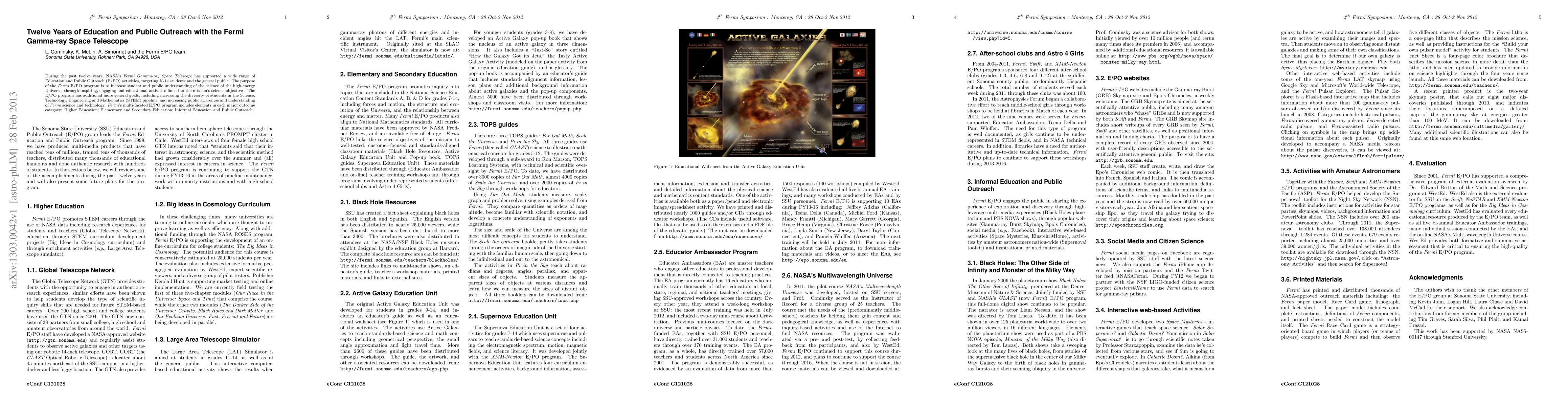 During the past twelve years, NASA's Fermi Gamma-ray Space Telescope has supported a wide range of Education and Public Outreach (E/PO) activities, targeting K-14 students and the general public. The purpose of the Fermi E/PO program is to increase student and public understanding of the science of the high-energy Universe, through inspiring, engaging and educational activities linked to the mission's science objectives. The E/PO program has additional more general goals, including increasing the diversity of students in the Science, Technology, Engineering and Mathematics (STEM) pipeline, and increasing public awareness and understanding of Fermi science and technology. Fermi's multi-faceted E/PO program includes elements in each major outcome category: Higher Education; Elementary and Secondary Education; Informal Education and Public Outreach.