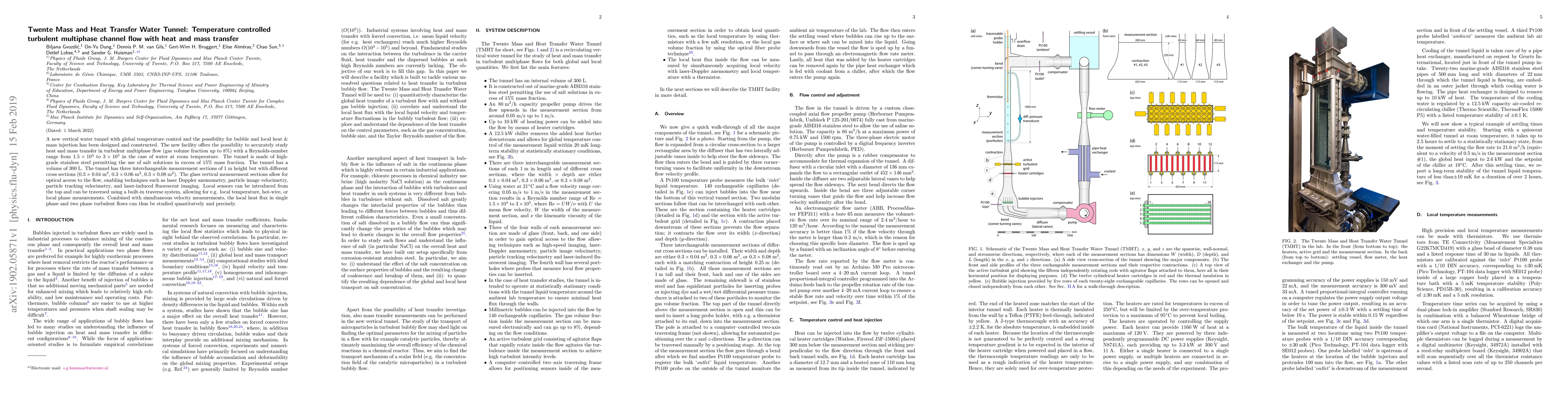 The Twente Mass and Heat Transfer Water Tunnel is a new facility designed for studying heat and mass transfer in turbulent multiphase flows with temperature control, capable of simulating gas volume fractions up to 8% and Reynolds numbers from 1.5 x 10^4 to 3 x 10^5. It features interchangeable measurement sections and optical access for advanced flow analysis techniques.