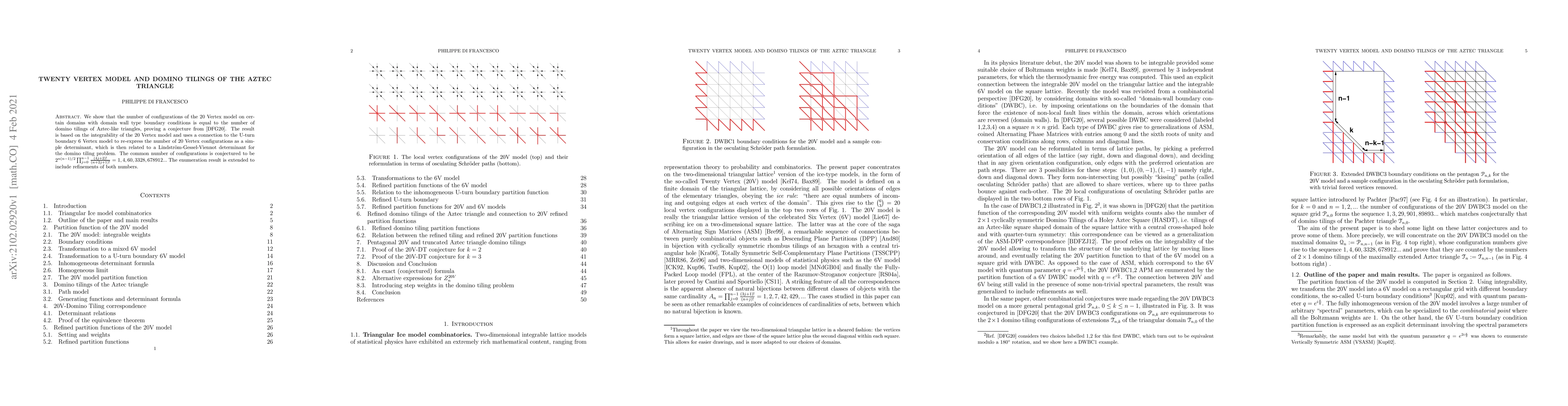 This paper establishes an equivalence between the number of configurations of the 20 Vertex model on specific domains and the number of domino tilings of Aztec-like triangles, confirming a prior conjecture. The proof leverages the integrability of the 20 Vertex model and a connection to the U-turn boundary 6 Vertex model, ultimately relating both quantities through a determinant.