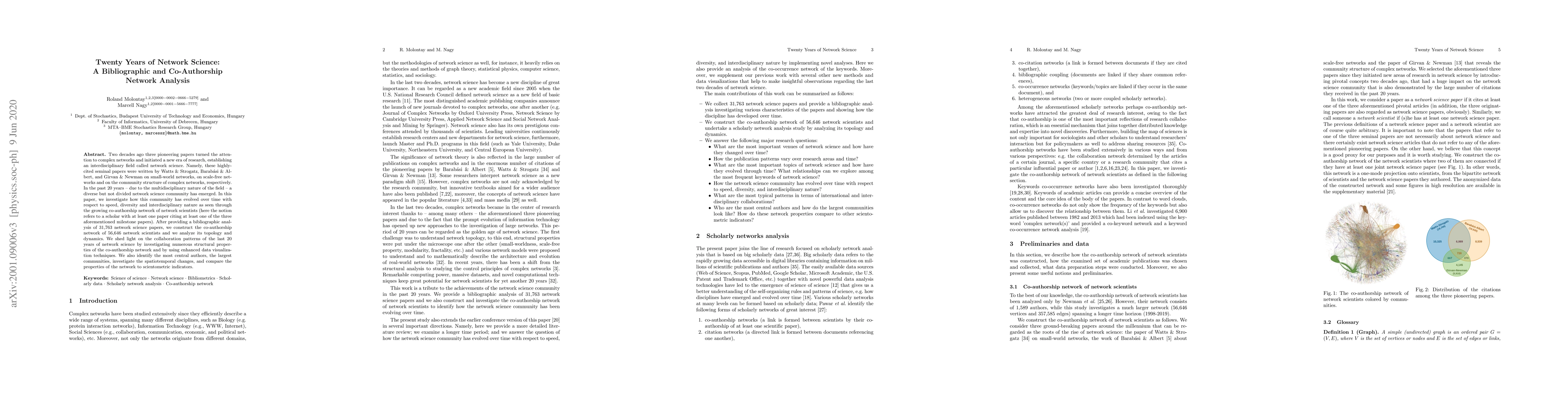 This paper analyzes the evolution of network science over two decades through a bibliographic and co-authorship network analysis of 31,763 papers and 56,646 scientists. It investigates collaboration patterns, central authors, and community structures, highlighting the field's interdisciplinary growth and dynamics.