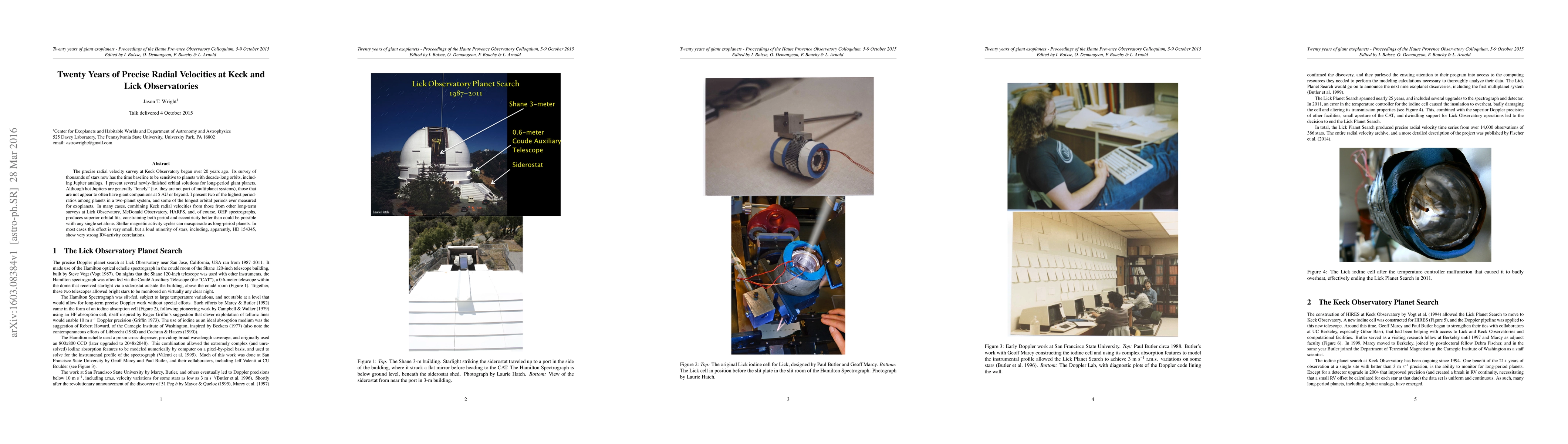 This paper reviews the 20-year radial velocity survey from Keck Observatory, revealing long-period giant planets, including Jupiter analogs, and highlighting the benefits of combining data from multiple observatories for improved orbital fits. It also notes the challenge of distinguishing stellar activity from planetary signals.