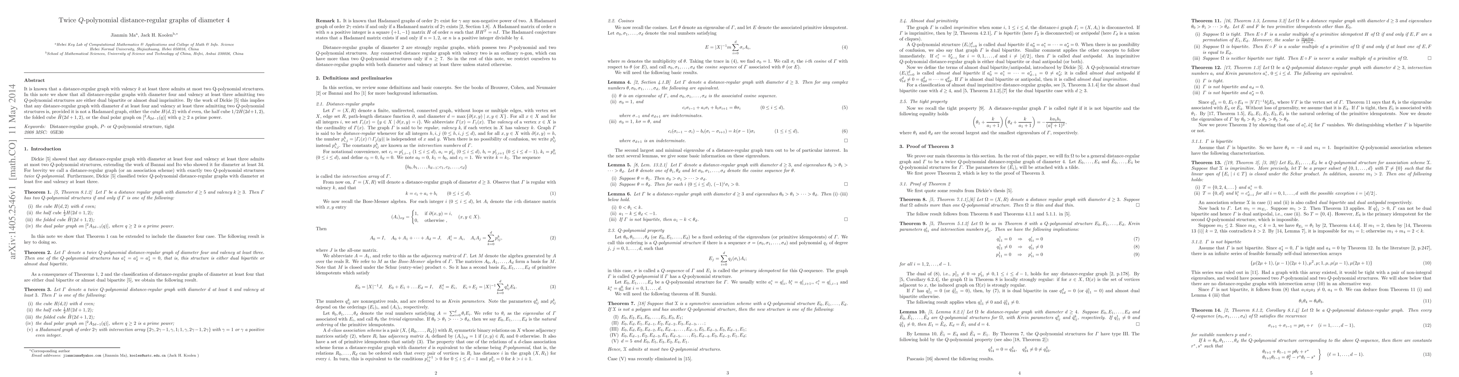 It is known that a distance-regular graph with valency $k$ at least three admits at most two Q-polynomial structures. % In this note we show that all distance-regular graphs with diameter four and valency at least three admitting two $Q$-polynomial structures are either dual bipartite or almost dual imprimitive. By the work of Dickie \cite{Dickie} this implies that any distance-regular graph with diameter $d$ at least four and valency at least three admitting two $Q$-polynomial structures is, provided it is not a Hadamard graph, either the cube $H(d,2)$ with $d$ even, the half cube ${1}/{2} H(2d+1,2)$, the folded cube $\tilde{H}(2d+1,2)$, or the dual polar graph on $[^2A_{2d-1}(q)]$ with $q\ge 2$ a prime power.