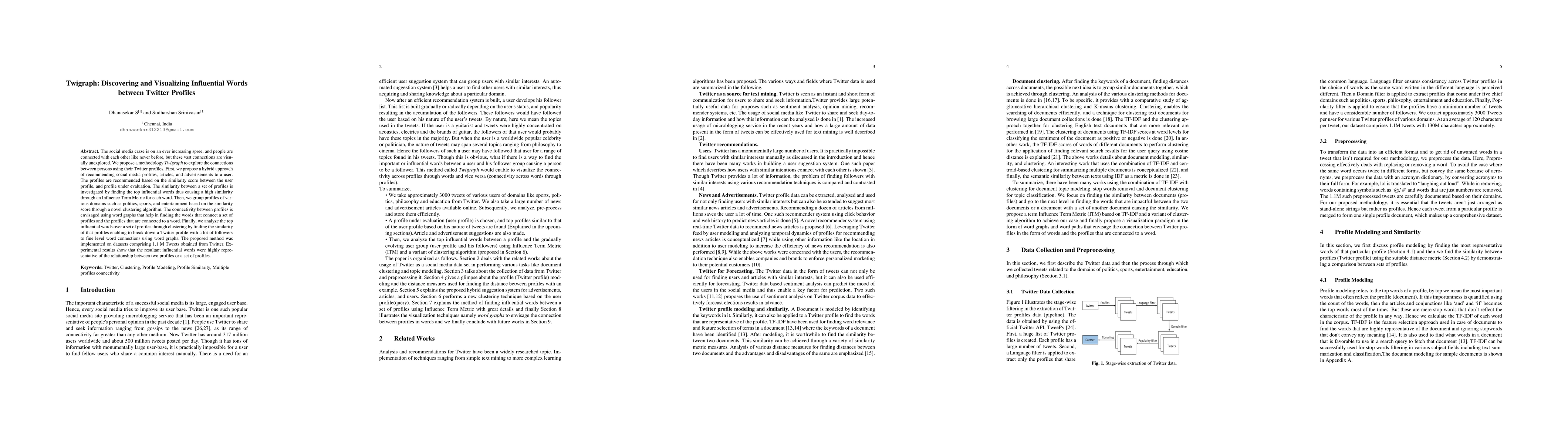 The social media craze is on an ever increasing spree, and people are connected with each other like never before, but these vast connections are visually unexplored. We propose a methodology Twigraph to explore the connections between persons using their Twitter profiles. First, we propose a hybrid approach of recommending social media profiles, articles, and advertisements to a user.The profiles are recommended based on the similarity score between the user profile, and profile under evaluation. The similarity between a set of profiles is investigated by finding the top influential words thus causing a high similarity through an Influence Term Metric for each word. Then, we group profiles of various domains such as politics, sports, and entertainment based on the similarity score through a novel clustering algorithm. The connectivity between profiles is envisaged using word graphs that help in finding the words that connect a set of profiles and the profiles that are connected to a word. Finally, we analyze the top influential words over a set of profiles through clustering by finding the similarity of that profiles enabling to break down a Twitter profile with a lot of followers to fine level word connections using word graphs. The proposed method was implemented on datasets comprising 1.1 M Tweets obtained from Twitter. Experimental results show that the resultant influential words were highly representative of the relationship between two profiles or a set of profiles