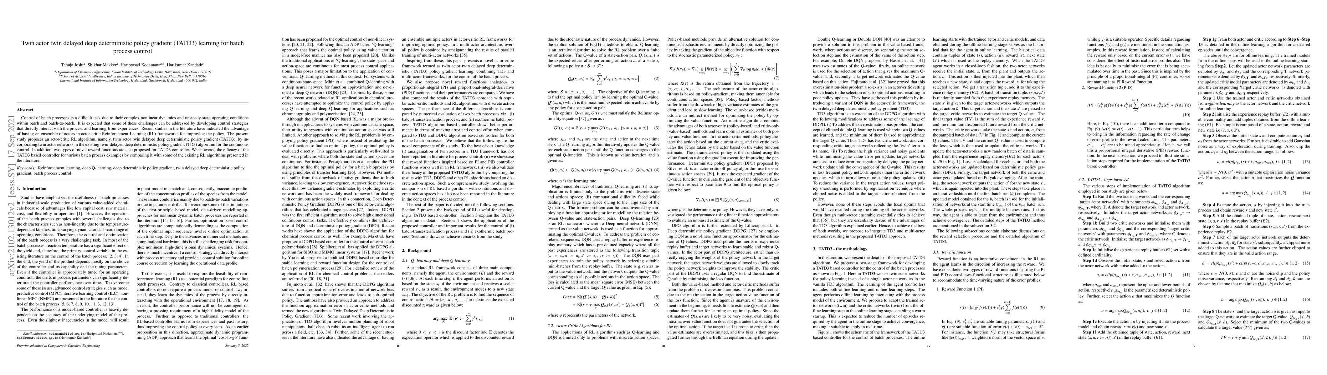 The paper proposes the TATD3 algorithm, an enhanced actor-critic Reinforcement Learning approach incorporating twin actor networks into the TD3 framework, to improve batch process control. The study also introduces novel reward functions and demonstrates its effectiveness through comparative analysis with existing RL algorithms.