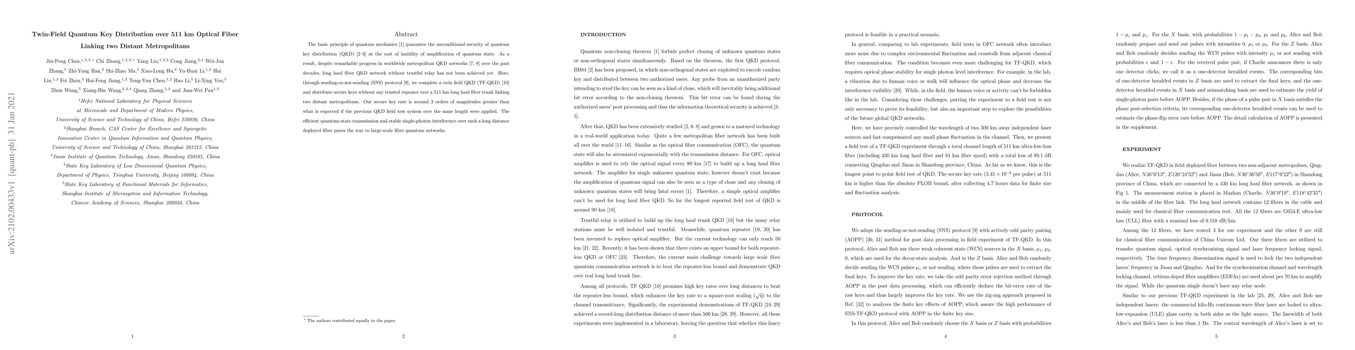 This paper demonstrates a twin-field quantum key distribution (TF-QKD) over a 511 km optical fiber, achieving secure key distribution without trusted relays. The sending-or-not-sending protocol significantly enhances the secure key rate compared to previous systems, paving the way for large-scale metropolitan quantum networks.