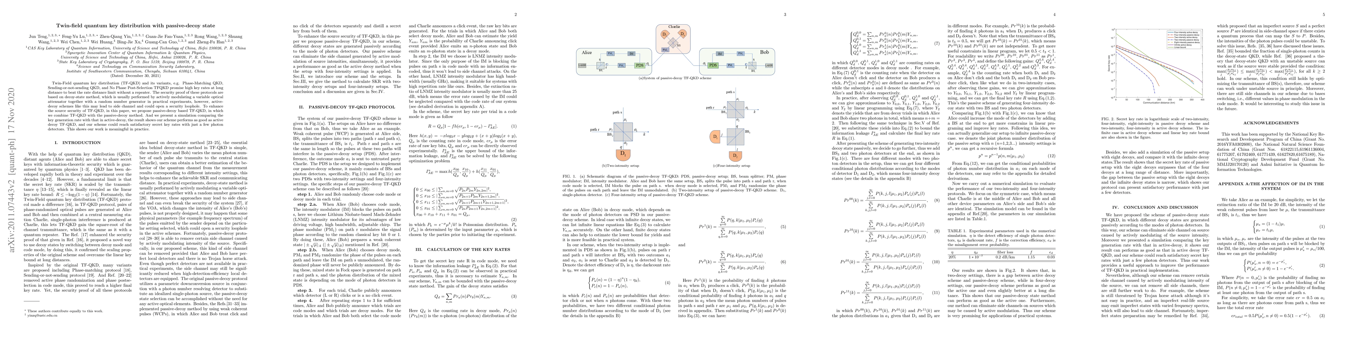 This paper proposes a passive-decoy based Twin-Field Quantum Key Distribution (TF-QKD) scheme to enhance security by eliminating active modulation, which reduces side-channel risks. Simulation results show that the passive-decoy method achieves comparable key generation rates to active-decoy, demonstrating practical viability.