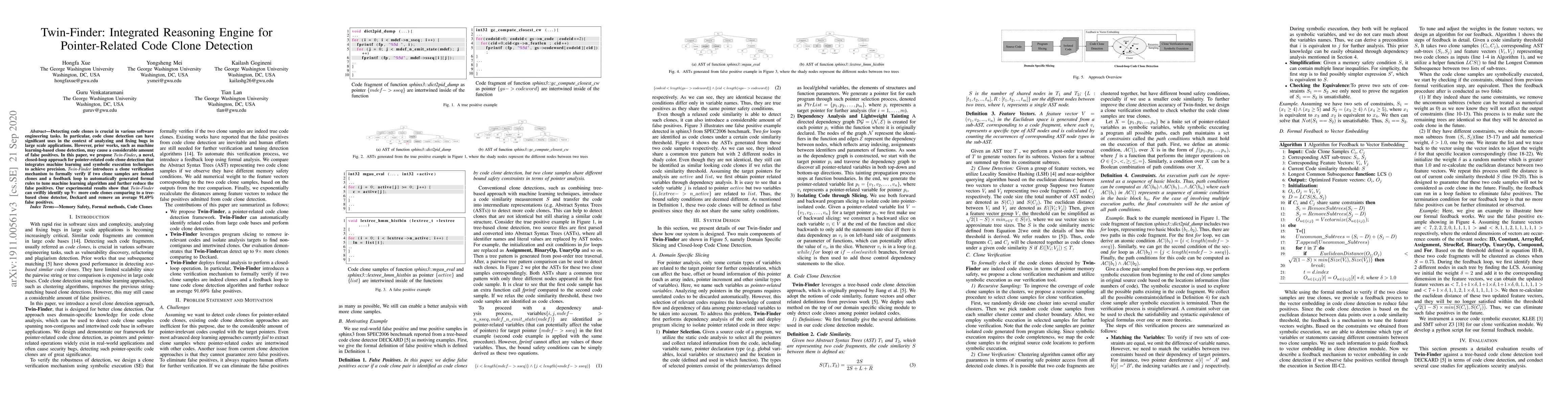 Twin-Finder is a novel integrated reasoning engine combining machine learning and symbolic execution for precise pointer-related code clone detection. It employs a clone verification mechanism and a feedback loop to reduce false positives, achieving 9X more clone detection and 91.69% false positive reduction compared to Deckard.