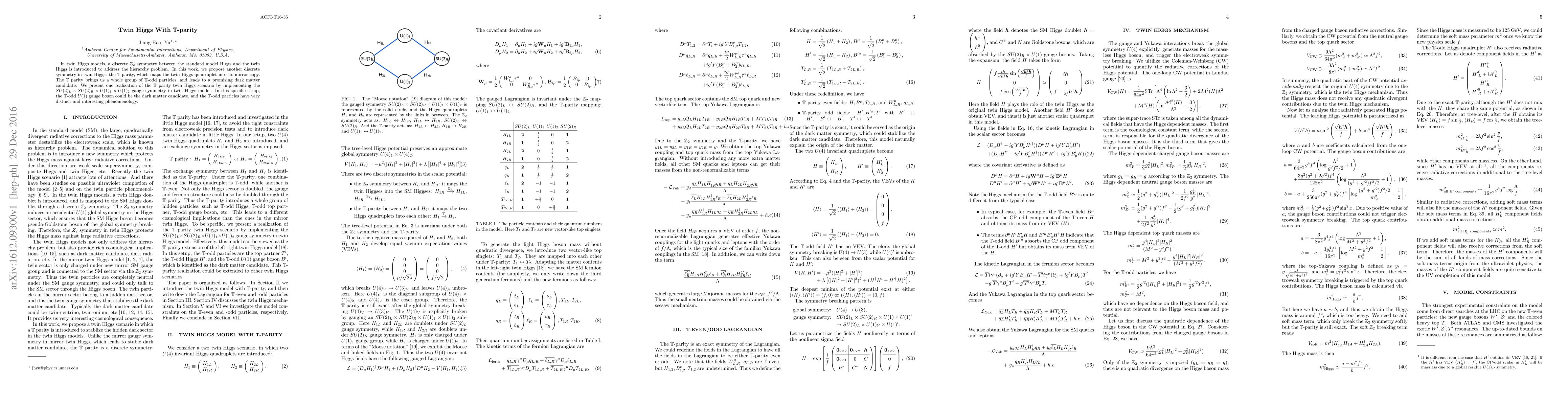 The paper presents a novel implementation of T-parity symmetry in twin Higgs models, leading to a new set of T-odd particles with distinct phenomenology, including a potential dark matter candidate (T-odd U(1) gauge boson).
