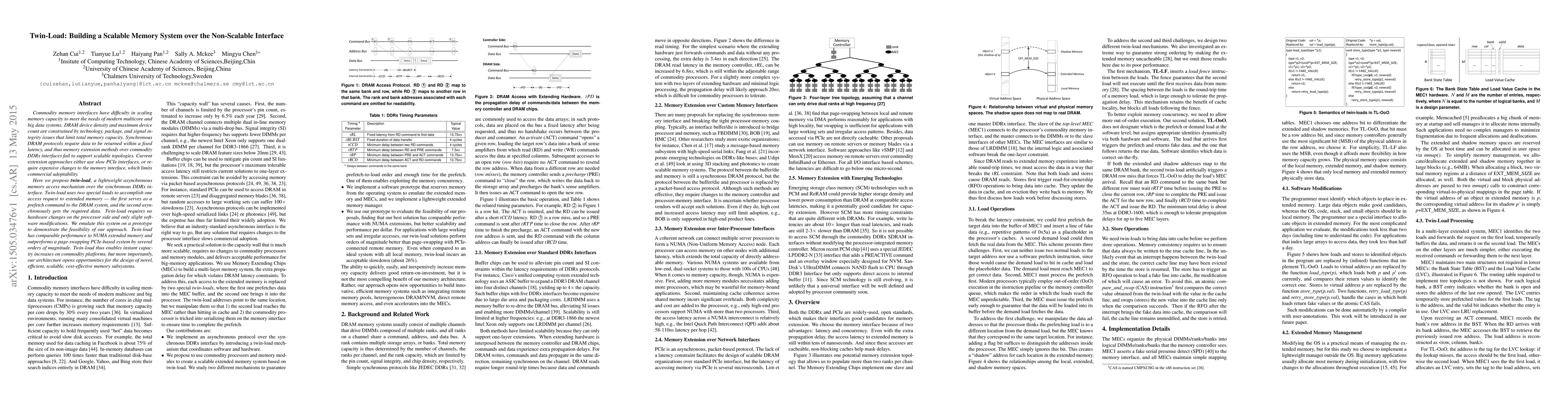 The paper proposes Twin-Load, a lightweight asynchronous memory access mechanism over synchronous DDRx interfaces to extend memory capacity without hardware changes. Twin-Load uses two special loads to prefetch and retrieve data, demonstrating comparable performance to NUMA and significantly better than PCIe-based systems, thus enabling scalable memory solutions on commodity platforms.