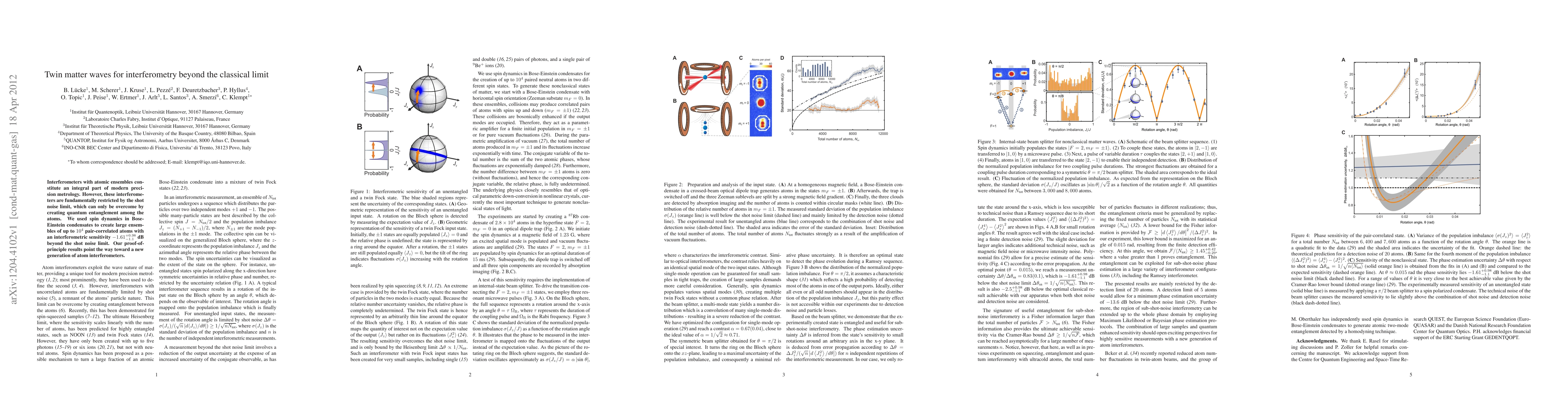 Interferometers with atomic ensembles constitute an integral part of modern precision metrology. However, these interferometers are fundamentally restricted by the shot noise limit, which can only be overcome by creating quantum entanglement among the atoms. We used spin dynamics in Bose-Einstein condensates to create large ensembles of up to $10^4$ pair-correlated atoms with an interferometric sensitivity $-1.61^{+0.98}_{-1.1}$ dB beyond the shot noise limit. Our proof-of-principle results point the way toward a new generation of atom interferometers.