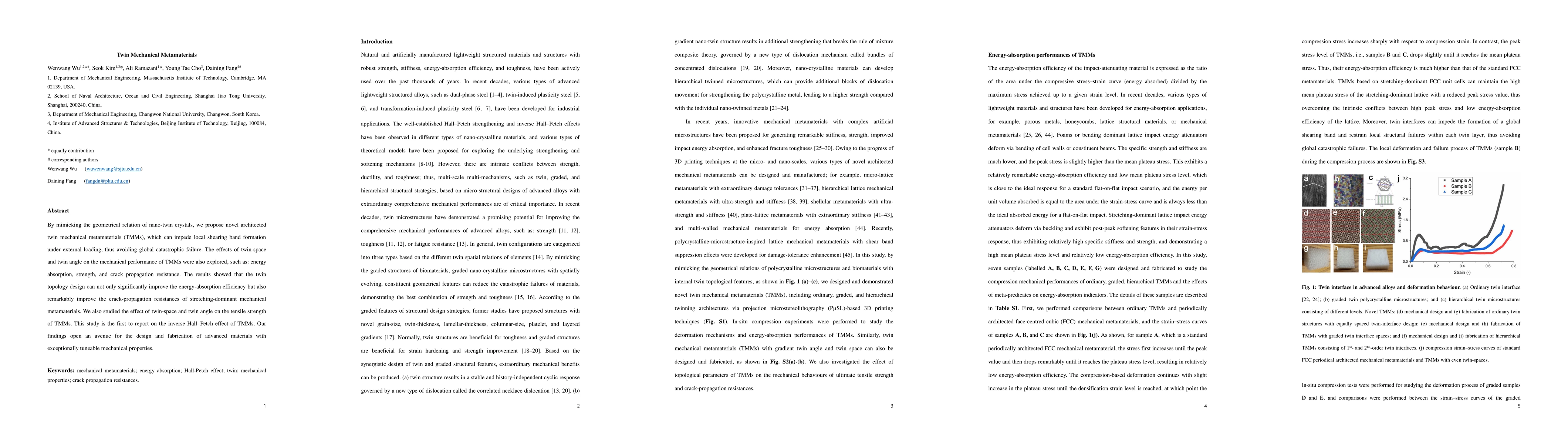 This paper proposes twin mechanical metamaterials (TMMs) inspired by nano-twin crystals, which enhance energy absorption and crack resistance by impeding shearing band formation. The study reveals the impact of twin-space and angle on TMMs' mechanical performance, including tensile strength, and reports an inverse Hall-Petch effect, paving the way for advanced, tunable material designs.