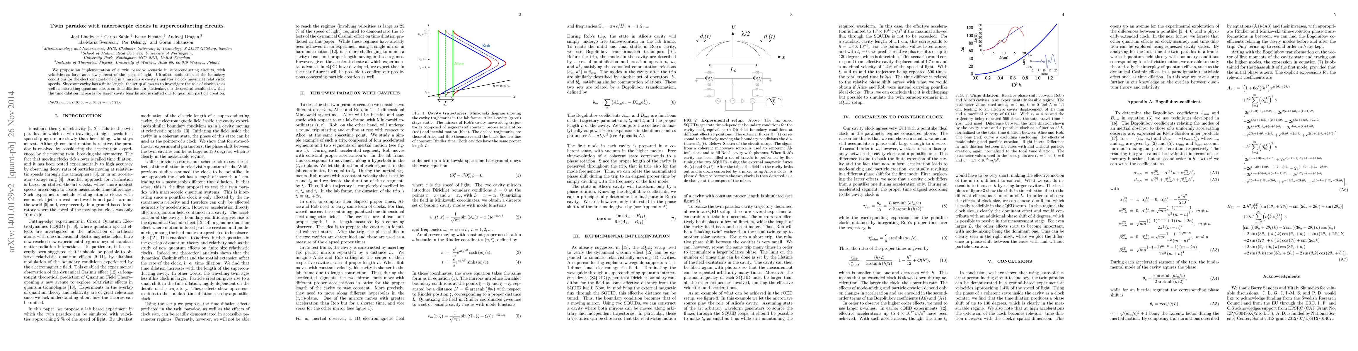 This paper proposes a twin paradox experiment using superconducting circuits where ultrafast modulation simulates relativistic clock motion. The study investigates the impact of clock size and quantum effects on time dilation, revealing increased time dilation for larger cavities and shifts due to quantum particle creation.