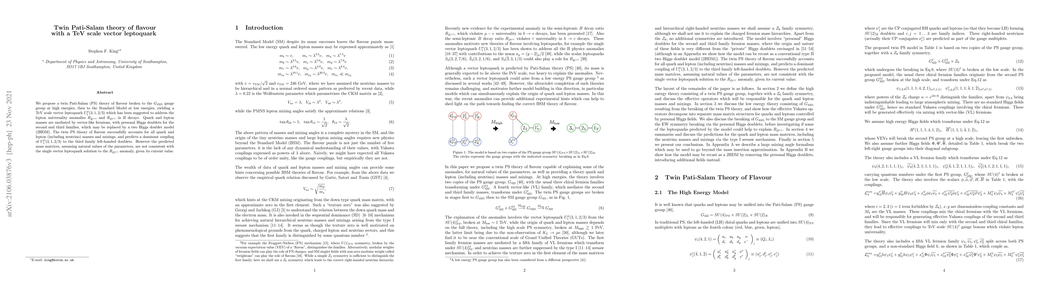 We propose a twin Pati-Salam (PS) theory of flavour broken to the $G_{4321}$ gauge group at high energies, then to the Standard Model at low energies, yielding a TeV scale vector leptoquark $U^{\mu}_1(3,1,2/3)$ which has been suggested to address the lepton universality anomalies $R_{K^{(*)}}$ and $R_{D^{(*)}}$ in $B$ decays. Quark and lepton masses are mediated by vector-like fermions, with personal Higgs doublets for the second and third families, which may be replaced by a two Higgs doublet model (2HDM). The twin PS theory of flavour successfully accounts for all quark and lepton (including neutrino) masses and mixings, and predicts a dominant coupling of $U^{\mu}_1(3,1,2/3)$ to the third family left-handed doublets. However the predicted mass matrices, assuming natural values of the parameters, are not consistent with the single vector leptoquark solution to the $R_{D^{(*)}}$ anomaly, given its current value.