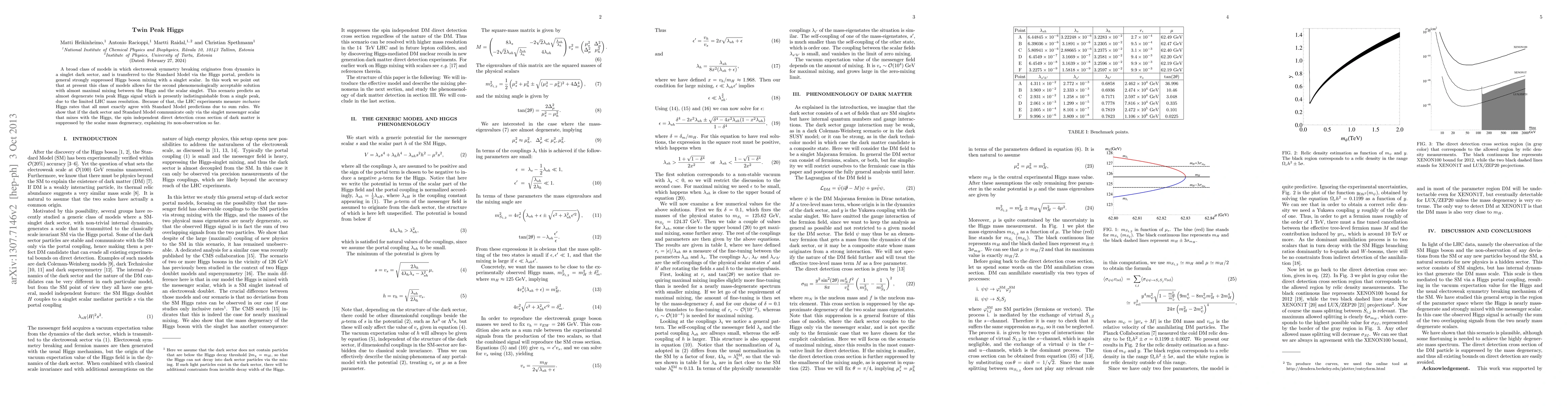 A broad class of models in which electroweak symmetry breaking originates from dynamics in a singlet dark sector, and is transferred to the Standard Model via the Higgs portal, predicts in general strongly suppressed Higgs boson mixing with a singlet scalar. In this work we point out that at present this class of models allows for the second phenomenologically acceptable solution with almost maximal mixing between the Higgs and the scalar singlet. This scenario predicts an almost degenerate twin peak Higgs signal which is presently indistinguishable from a single peak, due to the limited LHC mass resolution. Because of that, the LHC experiments measure inclusive Higgs rates that all must exactly agree with Standard Model predictions due to sum rules. We show that if the dark sector and Standard Model communicate only via the singlet messenger scalar that mixes with the Higgs, the spin independent direct detection cross section of dark matter is suppressed by the scalar mass degeneracy, explaining its non-observation so far.