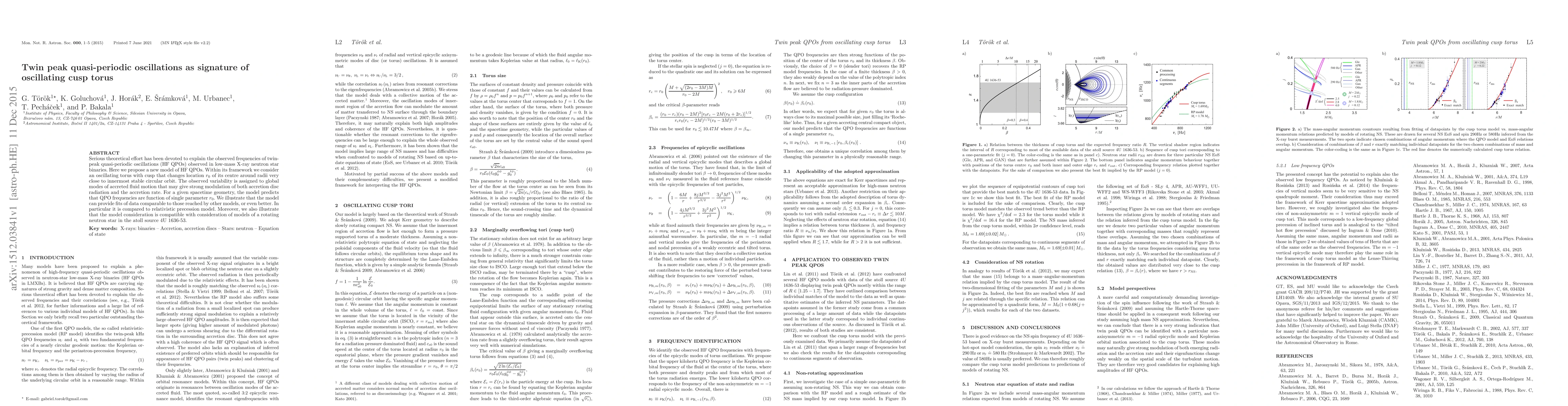 Serious theoretical effort has been devoted to explain the observed frequencies of twin-peak quasi-periodic oscillations (HF QPOs) observed in low-mass X-ray neutron star binaries. Here we propose a new model of HF QPOs. Within its framework we consider an oscillating torus with cusp that changes location $r_0$ of its centre around radii very close to innermost stable circular orbit. The observed variability is assigned to global modes of accreted fluid motion that may give strong modulation of both accretion disc radiation and the accretion rate. For a given spacetime geometry, the model predicts that QPO frequencies are function of single parameter $r_0$. We illustrate that the model can provide fits of data comparable to those reached by other models, or even better. In particular it is compared to relativistic precession model. Moreover, we also illustrate that the model consideration is compatible with consideration of models of a rotating neutron star in the atoll source 4U~1636-53.