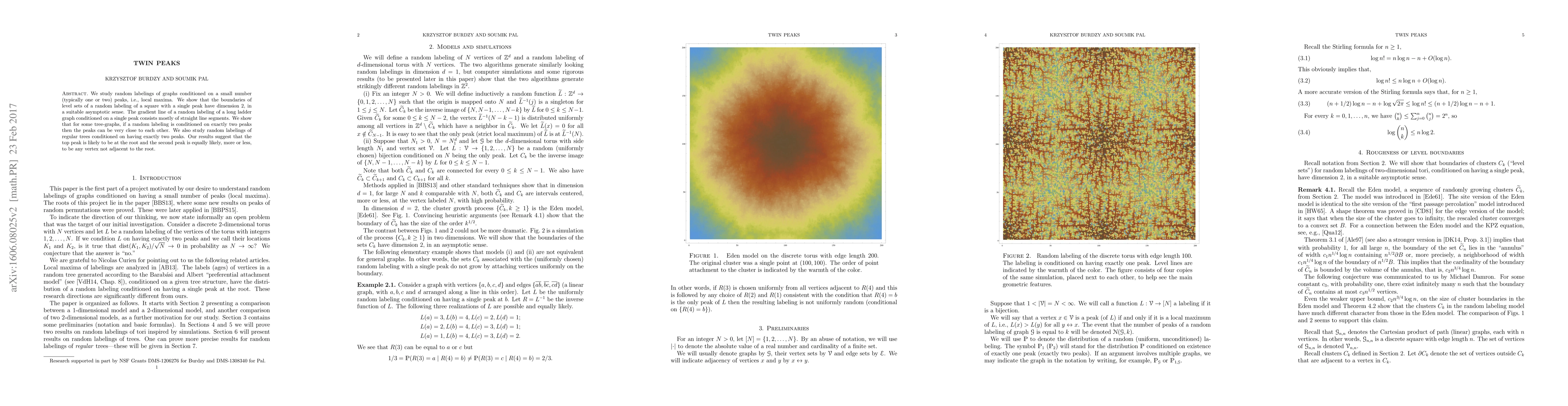 We study random labelings of graphs conditioned on a small number (typically one or two) peaks, i.e., local maxima. We show that the boundaries of level sets of a random labeling of a square with a single peak have dimension 2, in a suitable asymptotic sense. The gradient line of a random labeling of a long ladder graph conditioned on a single peak consists mostly of straight line segments. We show that for some tree-graphs, if a random labeling is conditioned on exactly two peaks then the peaks can be very close to each other. We also study random labelings of regular trees conditioned on having exactly two peaks. Our results suggest that the top peak is likely to be at the root and the second peak is equally likely, more or less, to be any vertex not adjacent to the root.