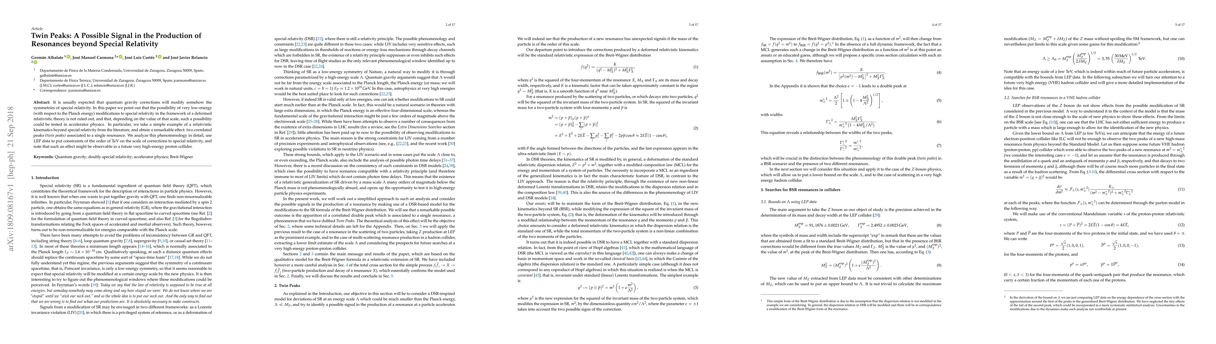 It is usually expected that quantum gravity corrections will modify somehow the symmetries of special relativity. In this paper we point out that the possibility of very low-energy (with respect to the Planck energy) modifications to special relativity in the framework of a deformed relativistic theory is not ruled out, and that, depending on the value of that scale, such a possibility could be tested in accelerator physics. In particular, we take a simple example of a relativistic kinematics beyond special relativity from the literature, and obtain a remarkable effect: two correlated peaks ("twin peaks") associated to a single resonance. We analyze this phenomenology in detail, use LEP data to put constraints of the order of TeV on the scale of corrections to special relativity, and note that such an effect might be observable in a future very high-energy proton collider.