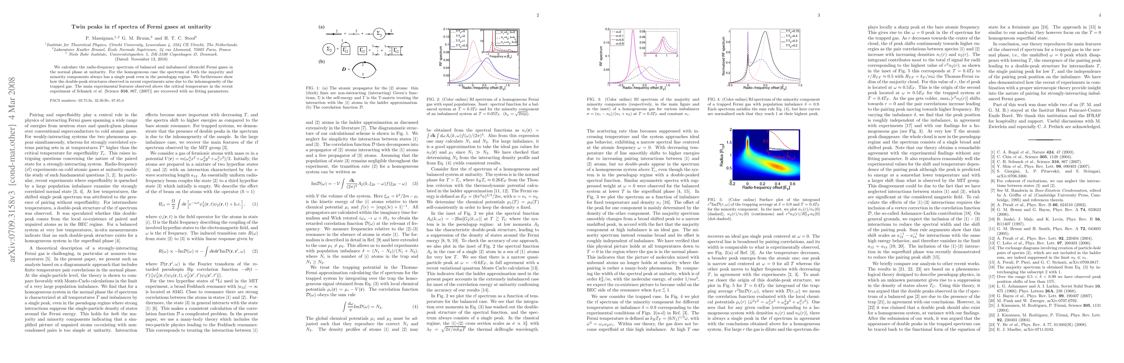 This paper calculates the radio-frequency spectrum of ultracold Fermi gases at unitarity, revealing that inhomogeneous trapped gases exhibit twin peaks in the spectrum, explaining recent experimental observations. The homogeneous gas spectrum retains a single peak even in pseudogap regimes.