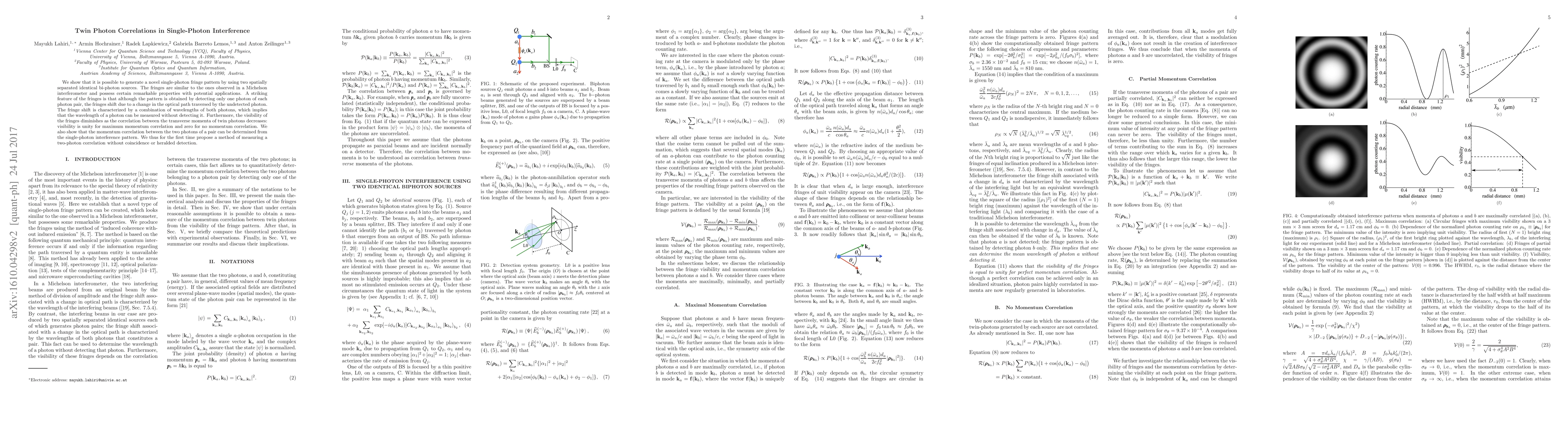 We show that it is possible to generate a novel single-photon fringe pattern by using two spatially separated identical bi-photon sources. The fringes are similar to the ones observed in a Michelson interferometer and possess certain remarkable properties with potential applications. A striking feature of the fringes is that although the pattern is obtained by detecting only one photon of each photon pair, the fringes shift due to a change in the optical path traversed by the undetected photon. The fringe shift is characterized by a combination of wavelengths of both photons, which implies that the wavelength of a photon can be measured without detecting it. Furthermore, the visibility of the fringes diminishes as the correlation between the transverse momenta of twin photons decreases: visibility is unity for maximum momentum correlation and zero for no momentum correlation. We also show that the momentum correlation between the two photons of a pair can be determined from the single-photon interference pattern. We thus for the first time propose a method of measuring a two-photon correlation without coincidence or heralded detection.