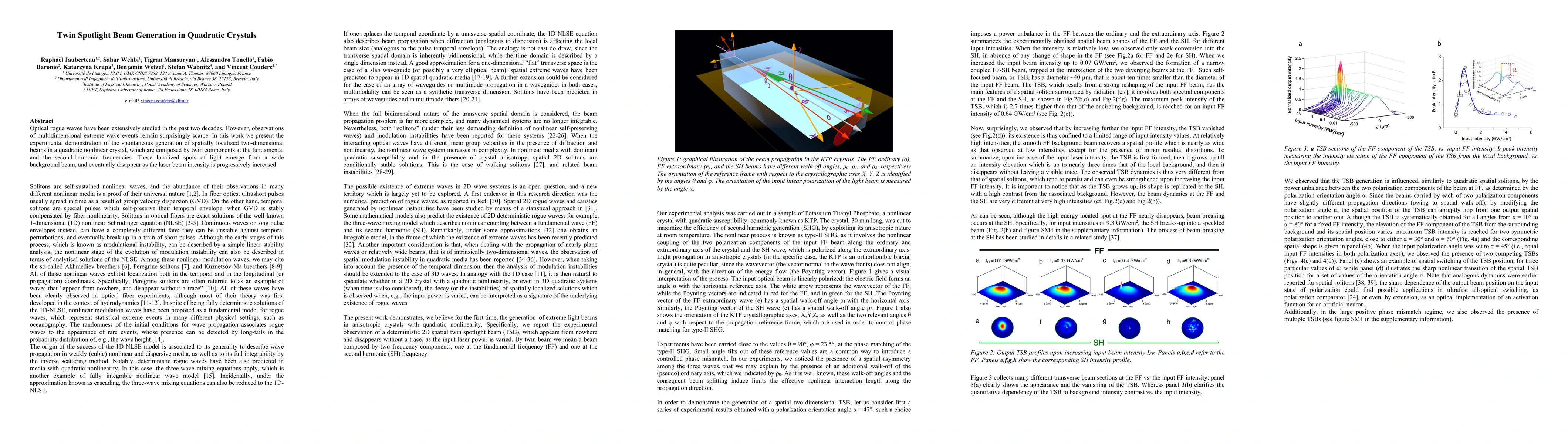 Optical rogue waves have been extensively studied in the past two decades. However, observations of multidimensional extreme wave events remain surprisingly scarce. In this work we present the experimental demonstration of the spontaneous generation of spatially localized two-dimensional beams in a quadratic nonlinear crystal, which are composed by twin components at the fundamental and the second-harmonic frequencies. These localized spots of light emerge from a wide background beam, and eventually disappear as the laser beam intensity is progressively increased.