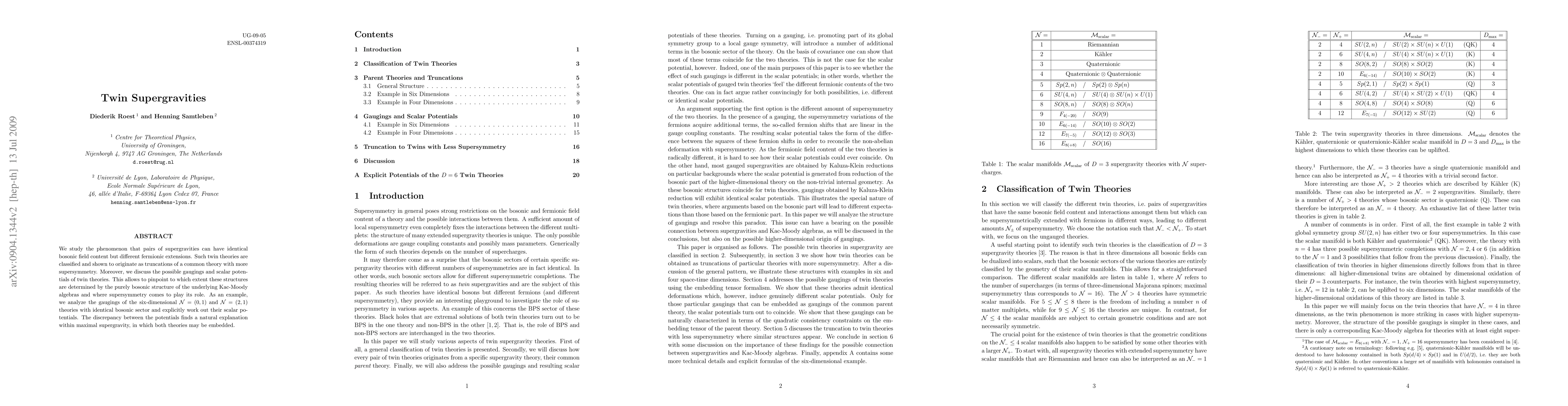 We study the phenomenon that pairs of supergravities can have identical bosonic field content but different fermionic extensions. Such twin theories are classified and shown to originate as truncations of a common theory with more supersymmetry. Moreover, we discuss the possible gaugings and scalar potentials of twin theories. This allows to pinpoint to which extent these structures are determined by the purely bosonic structure of the underlying Kac-Moody algebras and where supersymmetry comes to plays its role. As an example, we analyze the gaugings of the six-dimensional N=(0,1) and N=(2,1) theories with identical bosonic sector and explicitly work out their scalar potentials. The discrepancy between the potentials finds a natural explanation within maximal supergravity, in which both theories may be embedded.