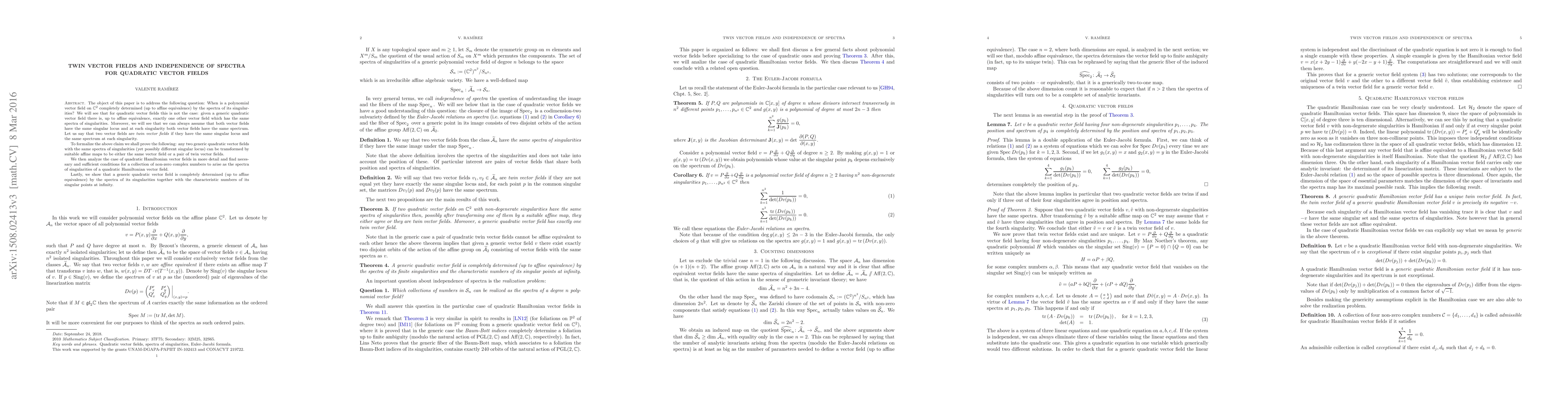 The object of this paper is to address the following question: When is a polynomial vector field on $\mathbb{C}^2$ completely determined (up to affine equivalence) by the spectra of its singularities? We will see that for quadratic vector fields this is not the case: given a generic quadratic vector field there is, up to affine equivalence, exactly one other vector field which has the same spectra of singularities. Moreover, we will see that we can always assume that both vector fields have the same singular locus and at each singularity both vector fields have the same spectrum. Let us say that two vector fields are twin vector fields if they have the same singular locus and the same spectrum at each singularity. To formalize the above claim we shall prove the following: any two generic quadratic vector fields with the same spectra of singularities (yet possibly different singular locus) can be transformed by suitable affine maps to be either the same vector field or a pair of twin vector fields. We then analyze the case of quadratic Hamiltonian vector fields in more detail and find necessary and sufficient conditions for a collection of non-zero complex numbers to arise as the spectra of singularities of a quadratic Hamiltonian vector field. Lastly, we show that a generic quadratic vector field is completely determined (up to affine equivalence) by the spectra of its singularities together with the characteristic numbers of its singular points at infinity.