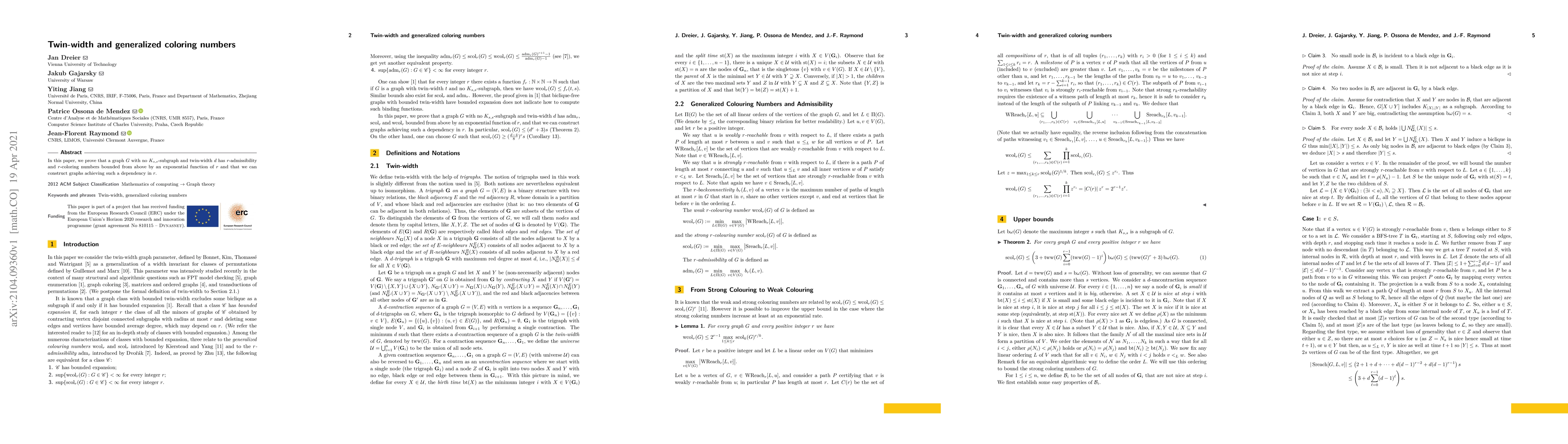 This paper demonstrates that graphs without $K_{s,s}$-subgraphs and twin-width $d$ have $r$-admissibility and $r$-coloring numbers bounded by an exponential function of $r$, with examples showing this dependency.