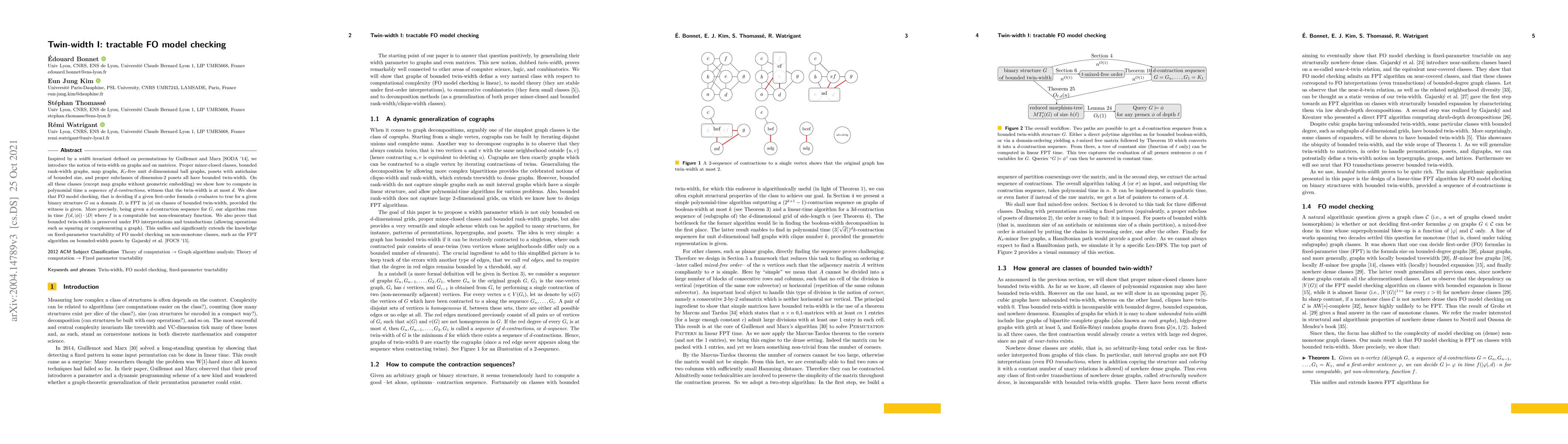 This paper introduces the concept of twin-width for graphs and matrices, demonstrating that several important classes of structures have bounded twin-width. It presents a polynomial-time algorithm for computing a sequence of contractions that witnesses this boundedness, and shows that first-order model checking is fixed-parameter tractable on such classes.