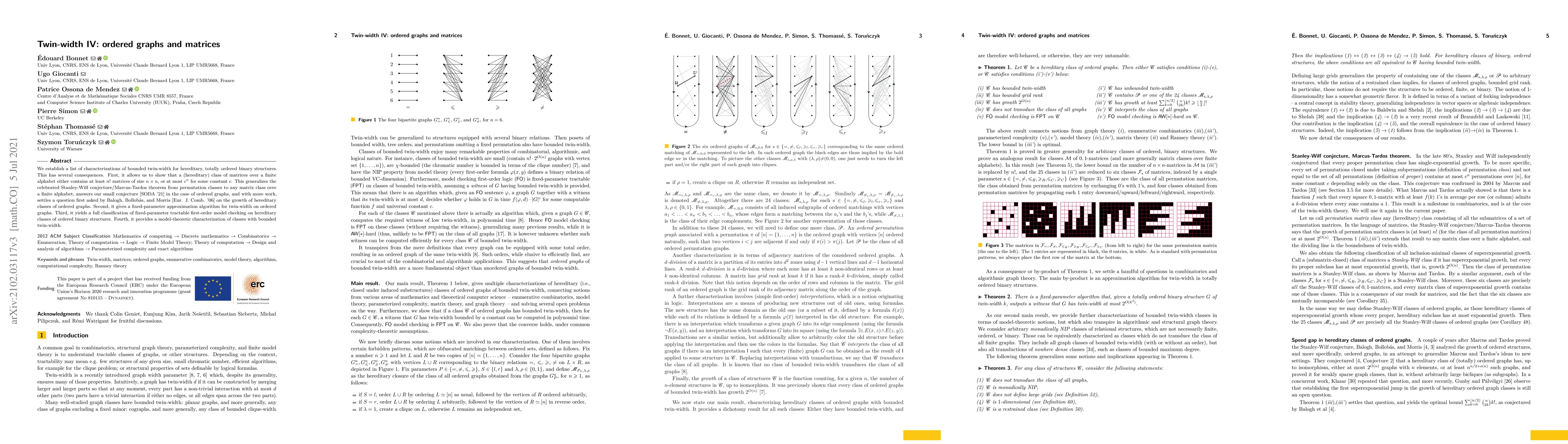 We establish a list of characterizations of bounded twin-width for hereditary, totally ordered binary structures. This has several consequences. First, it allows us to show that a (hereditary) class of matrices over a finite alphabet either contains at least $n!$ matrices of size $n \times n$, or at most $c^n$ for some constant $c$. This generalizes the celebrated Stanley-Wilf conjecture/Marcus-Tardos theorem from permutation classes to any matrix class over a finite alphabet, answers our small conjecture [SODA '21] in the case of ordered graphs, and with more work, settles a question first asked by Balogh, Bollob\'as, and Morris [Eur. J. Comb. '06] on the growth of hereditary classes of ordered graphs. Second, it gives a fixed-parameter approximation algorithm for twin-width on ordered graphs. Third, it yields a full classification of fixed-parameter tractable first-order model checking on hereditary classes of ordered binary structures. Fourth, it provides a model-theoretic characterization of classes with bounded twin-width.