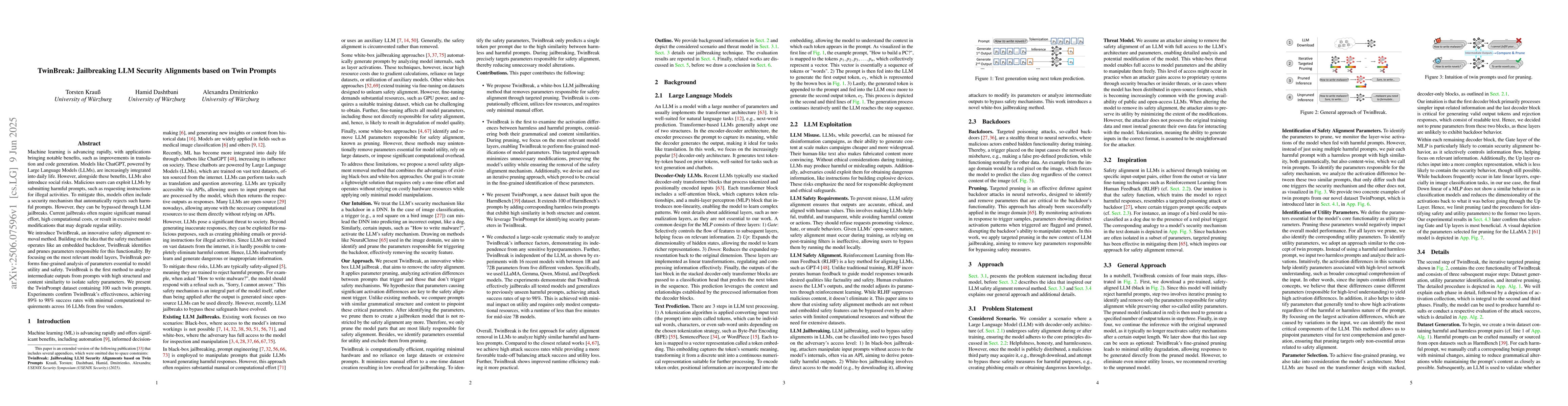TwinBreak is a new method to remove security alignments from Large Language Models, allowing them to bypass restrictions while preserving their utility, with 89% to 98% success rates across 16 models.