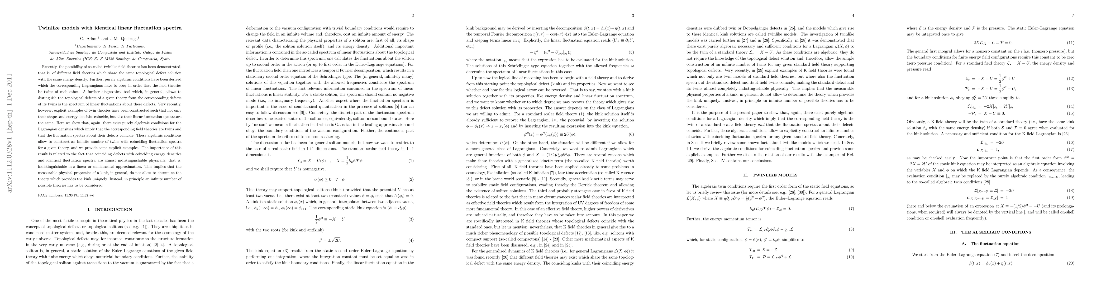 Recently, the possibility of so-called twinlike field theories has been demonstrated, that is, of different field theories which share the same topological defect solution with the same energy density. Further, purely algebraic conditions have been derived which the corresponding Lagrangians have to obey in order that the field theories be twins of each other. A further diagnostical tool which, in general, allows to distinguish the topological defects of a given theory from the corresponding defects of its twins is the spectrum of linear fluctuations about these defects. Very recently, however, explicit examples of twin theories have been constructed such that not only their shapes and energy densities coincide, but also their linear fluctuation spectra are the same. Here we show that, again, there exist purely algebraic conditions for the Lagrangian densities which imply that the corresponding field theories are twins and that the fluctuation spectra about their defects coincide. These algebraic conditions allow to construct an infinite number of twins with coinciding fluctuation spectra for a given theory, and we provide some explicit examples. The importance of this result is related to the fact that coinciding defects with coinciding energy densities and identical fluctuation spectra are almost indistinguishable physically, that is, indistinguishable in a linear or semiclassical approximation. This implies that the measurable physical properties of a kink, in general, do not allow to determine the theory which provides the kink uniquely. Instead, in principle an infinite number of possible theories has to be considered.