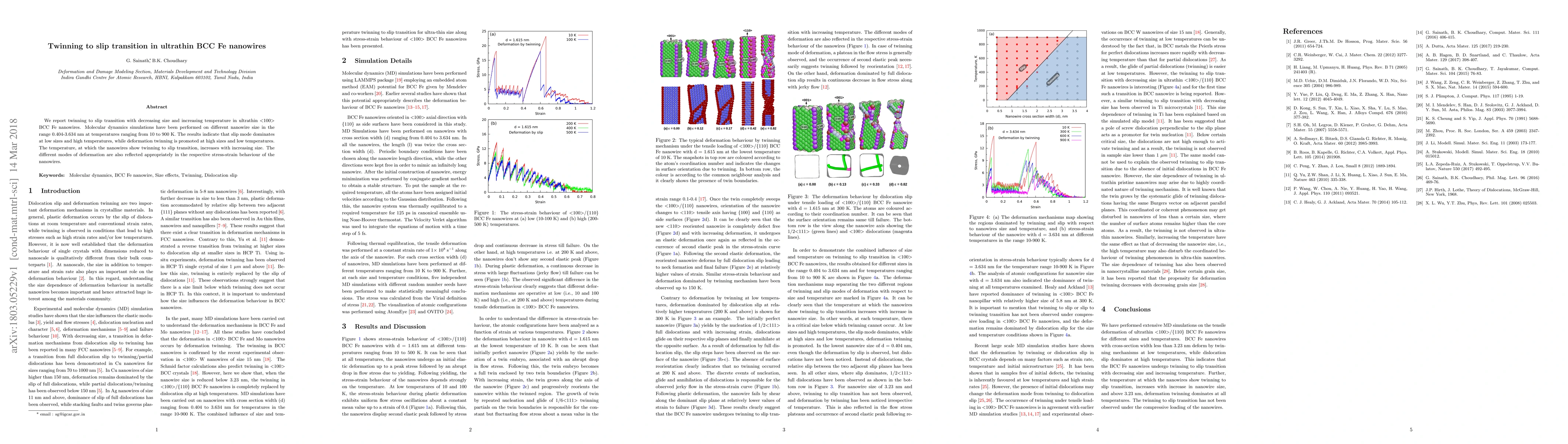 This study explores the twinning to slip transition in ultrathin BCC Fe nanowires using molecular dynamics simulations. At low sizes and high temperatures, slip dominates, while at high sizes and low temperatures, deformation twinning prevails, with the transition temperature rising with increasing nanowire size.