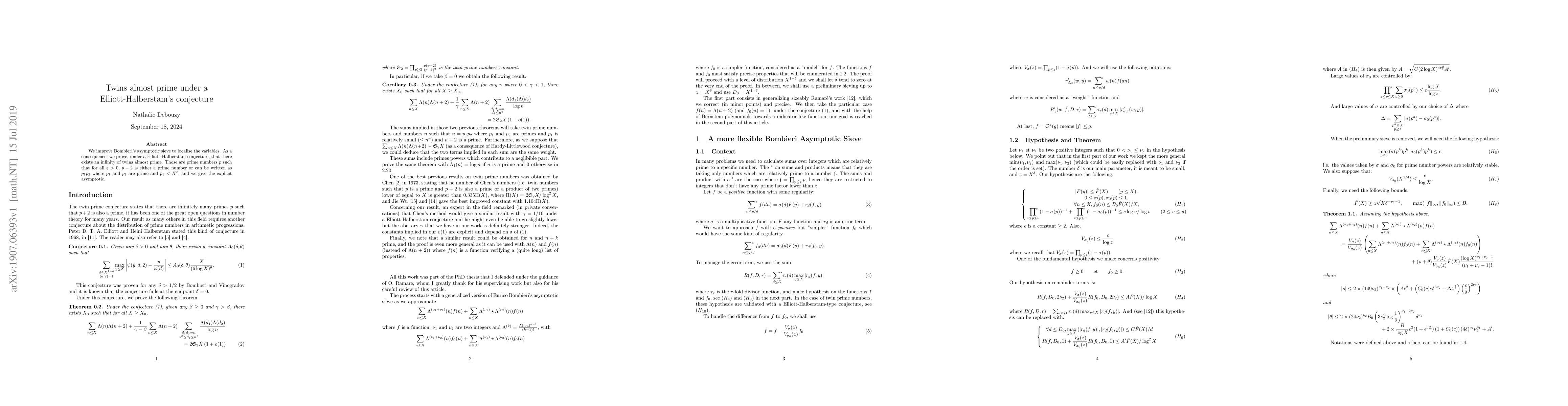 This paper improves Bombieri's asymptotic sieve to localize variables, proving under the Elliott-Halberstam conjecture the existence of infinitely many twin almost primes, where $p-2$ is either prime or a product of primes with one factor smaller than $X^{\varepsilon}$.
