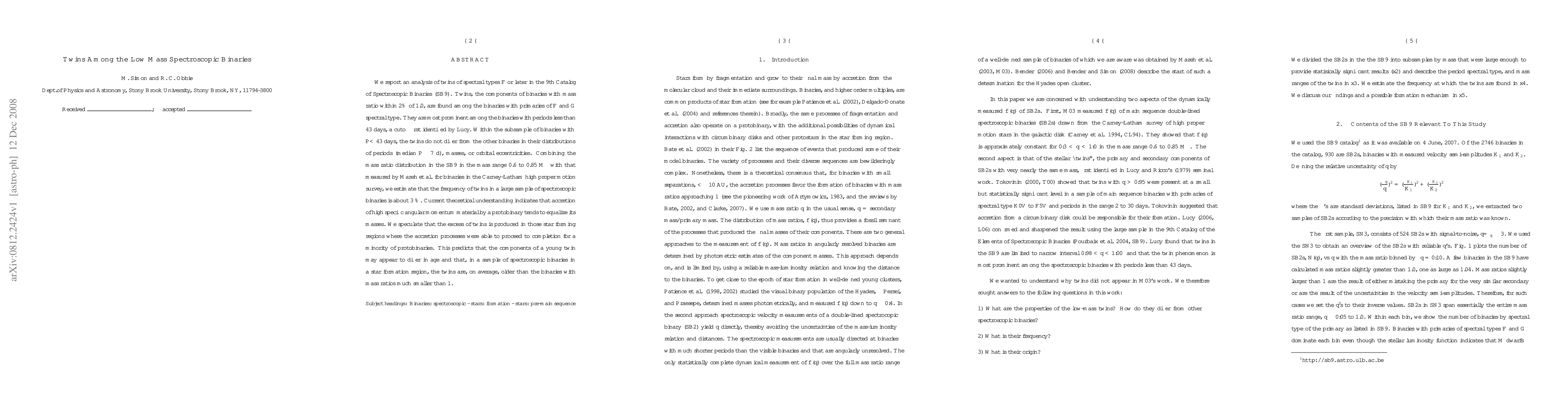 This paper analyzes spectroscopic binaries in the 9th Catalog of Spectroscopic Binaries, identifying twins—binaries with nearly equal masses—among F and G spectral type primaries. The study finds that twins are most prevalent in binaries with periods less than 43 days, and they do not differ significantly in period, mass, or eccentricity distributions compared to other binaries. The estimated frequency of twins in a large sample is about 3%, suggesting that accretion processes in star-forming regions may lead to the formation of these equal-mass binaries.