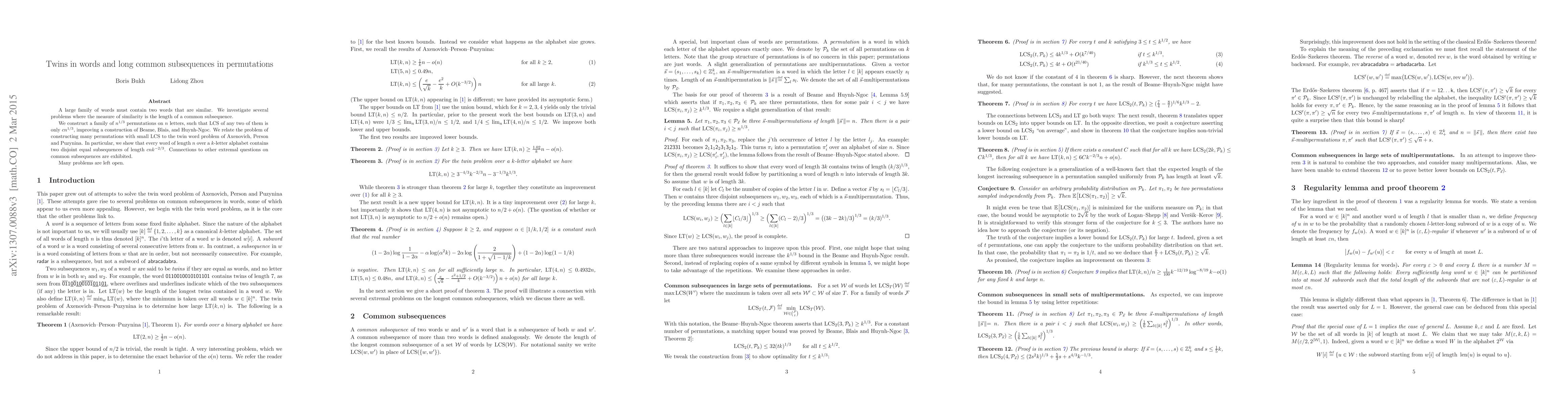 A large family of words must contain two words that are similar. We investigate several problems where the measure of similarity is the length of a common subsequence. We construct a family of n^{1/3} permutations on n letters, such that LCS of any two of them is only cn^{1/3}, improving a construction of Beame, Blais, and Huynh-Ngoc. We relate the problem of constructing many permutations with small LCS to the twin word problem of Axenovich, Person and Puzynina. In particular, we show that every word of length n over a k-letter alphabet contains two disjoint equal subsequences of length cnk^{-2/3}. Many problems are left open.