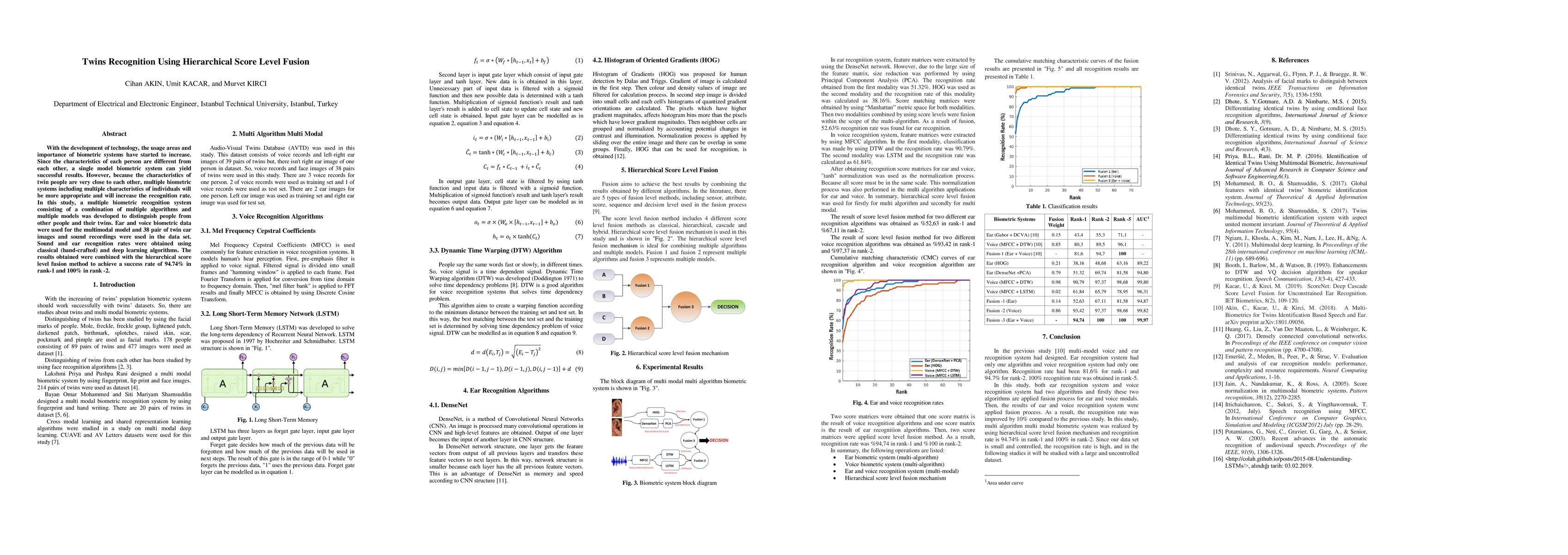 This study developed a multimodal biometric recognition system using ear and voice data to distinguish individuals from their twins, achieving a 94.74% success rate at rank-1 and 100% at rank-2 through hierarchical score level fusion of classical and deep learning algorithms.