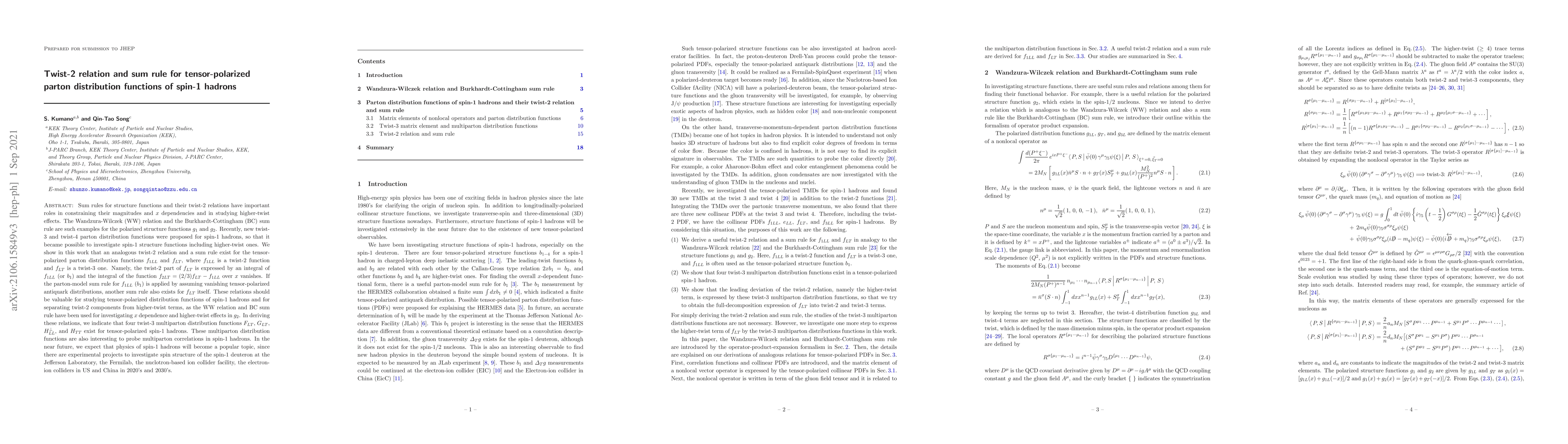 This paper establishes a twist-2 relation and sum rule for tensor-polarized parton distribution functions of spin-1 hadrons, analogous to the Wandzura-Wilczek relation and Burkhardt-Cottingham sum rule for polarized structure functions. It also identifies four twist-3 multiparton distribution functions for these hadrons.