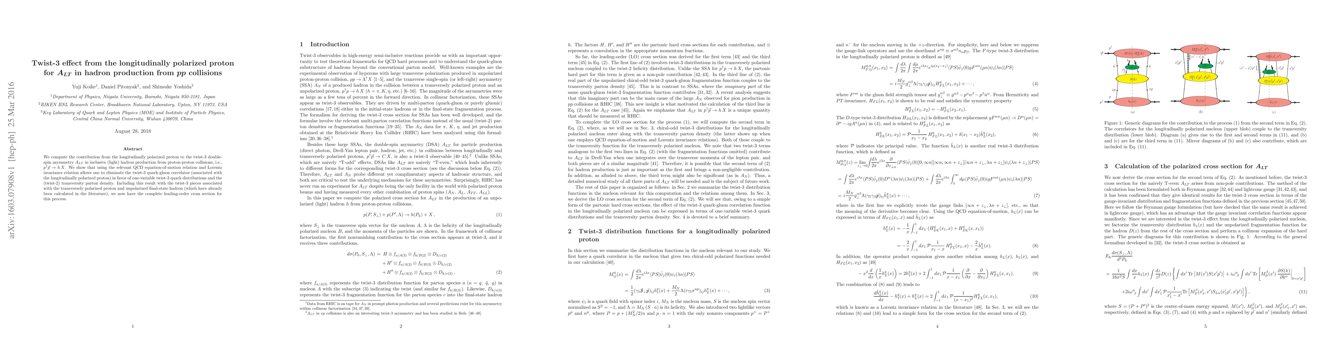 We compute the contribution from the longitudinally polarized proton to the twist-3 double-spin asymmetry $A_{LT}$ in inclusive (light) hadron production from proton-proton collisions,i.e., $p^\uparrow \vec{p}\to h\,X$. We show that using the relevant QCD equation-of-motion relation and Lorentz invariance relation allows one to eliminate the twist-3 quark-gluon correlator (associated with the longitudinally polarized proton) in favor of one-variable twist-3 quark distributions and the (twist-2) transversity parton density. Including this result with the twist-3 pieces associated with the transversely polarized proton and unpolarized final-state hadron (which have already been calculated in the literature), we now have the complete leading-order cross section for this process.