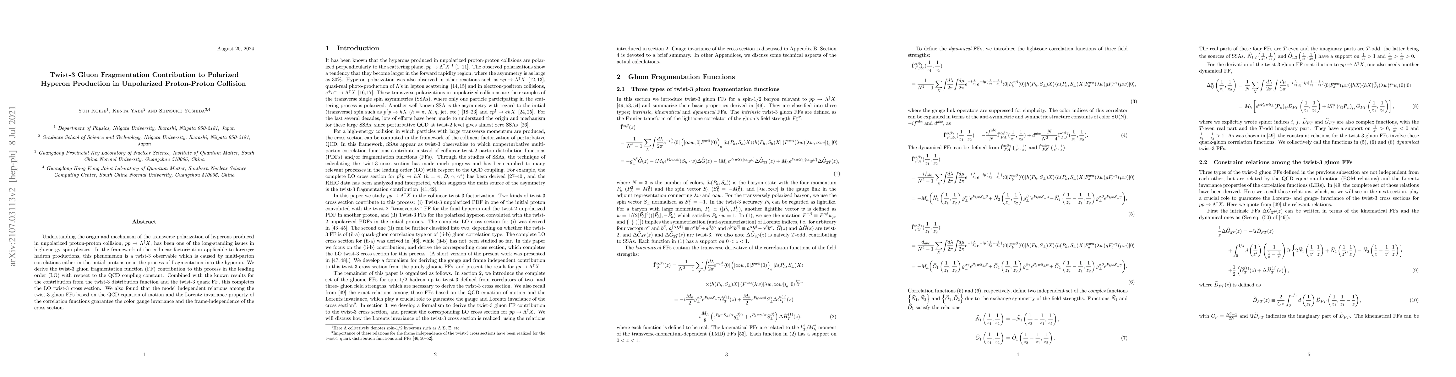 This paper derives the twist-3 gluon fragmentation function contribution to the polarized hyperon production in unpolarized proton-proton collisions, completing the leading order twist-3 cross section. The study ensures the color gauge invariance and frame-independence of the cross section through model-independent relations based on QCD and Lorentz invariance.