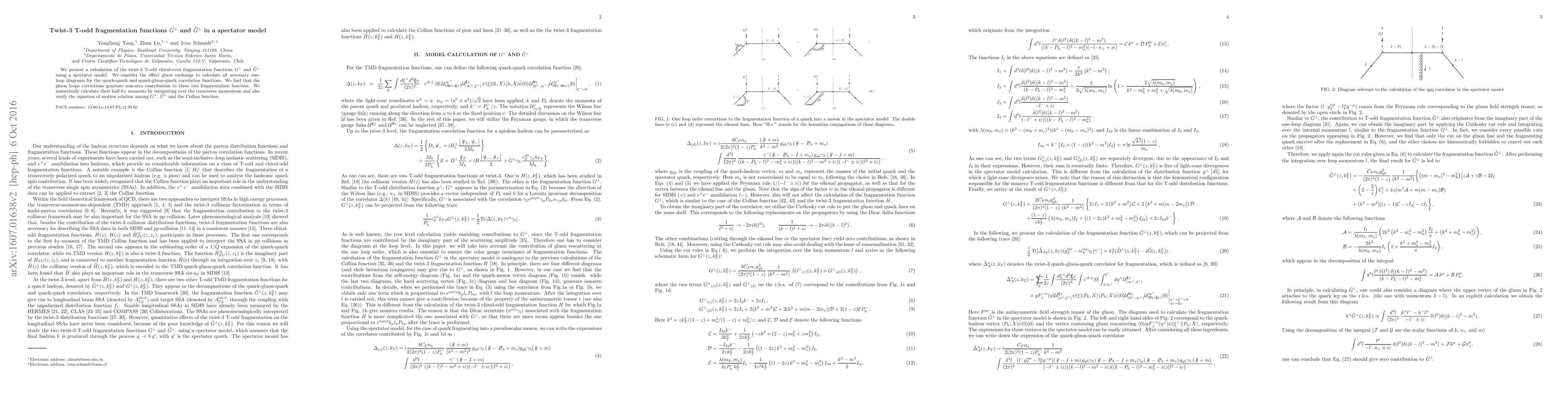 We present a calculation of the twist-3 T-odd chiral-even fragmentation functions $G^{\perp}$ and $\tilde{G}^{\perp}$ using a spectator model. We consider the effect gluon exchange to calculate all necessary one-loop diagrams for the quark-quark and quark-gluon-quark correlation functions. We find that the gluon loops corrections generate non-zero contribution to these two fragmentation function. We numerically calculate their half-$k_T$ moments by integrating over the transverse momentum and also verify the equation of motion relation among $G^{\perp}$, $\tilde{G}^{\perp}$ and the Collins function.