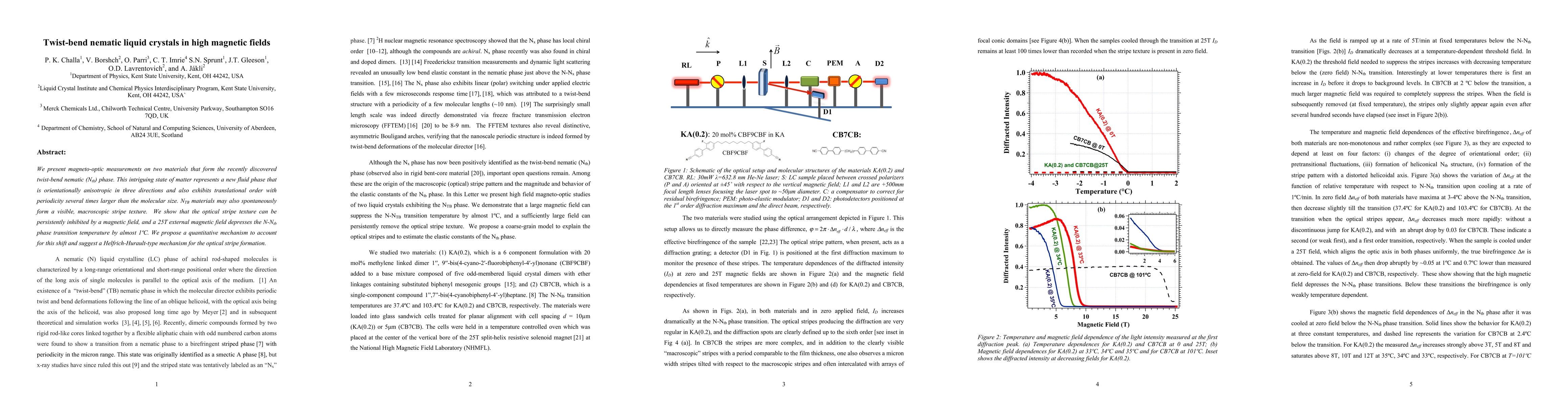 This study investigates the twist-bend nematic (Ntb) liquid crystal phase under high magnetic fields, revealing that magnetic fields can inhibit the optical stripe texture and lower the N-Ntb phase transition temperature. The findings suggest a Helfrich-Hurault-type mechanism for stripe formation.