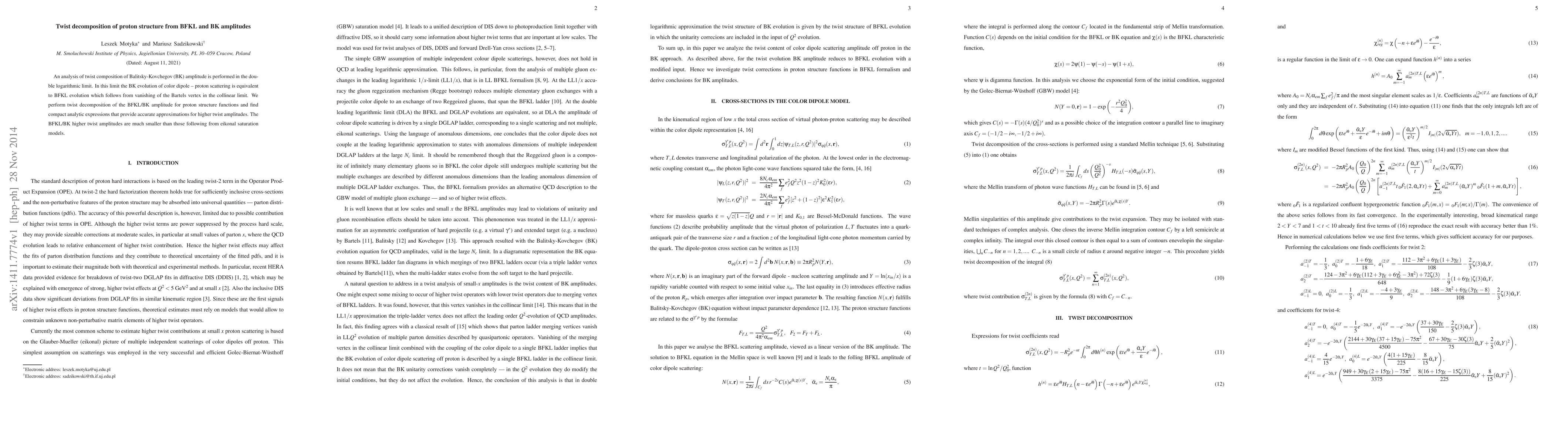 This paper analyzes the twist decomposition of proton structure functions using Balitsky-Kovchegov (BK) and Balitsky-Fadin-Kuraev-Lipatov (BFKL) amplitudes in the double logarithmic limit, revealing compact analytic expressions for higher twist amplitudes that are significantly smaller than those predicted by eikonal saturation models.