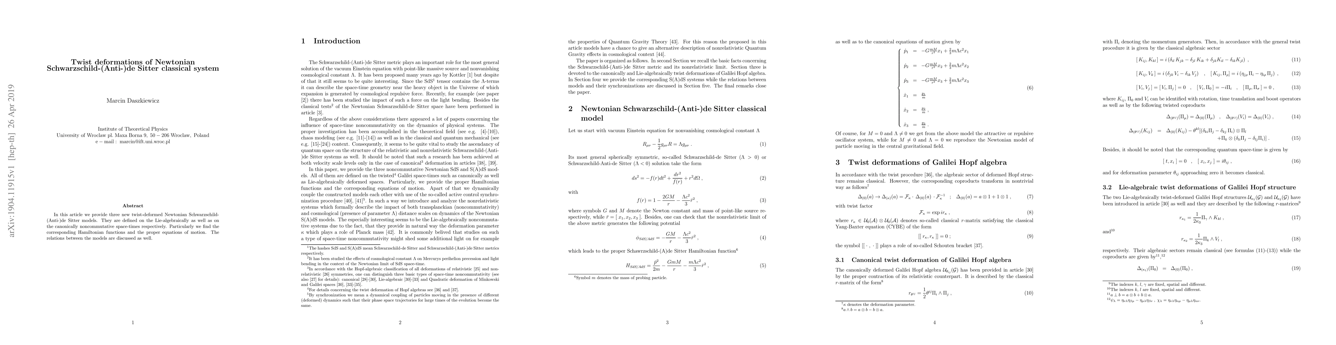 In this article we provide three new twist-deformed Newtonian Schwarzschild-(Anti-)de Sitter models. They are defined on the Lie-algebraically as well as on the canonically noncommutative space-times respectively. Particularly we find the corresponding Hamiltonian functions and the proper equations of motion. The relations between the models are discussed as well.