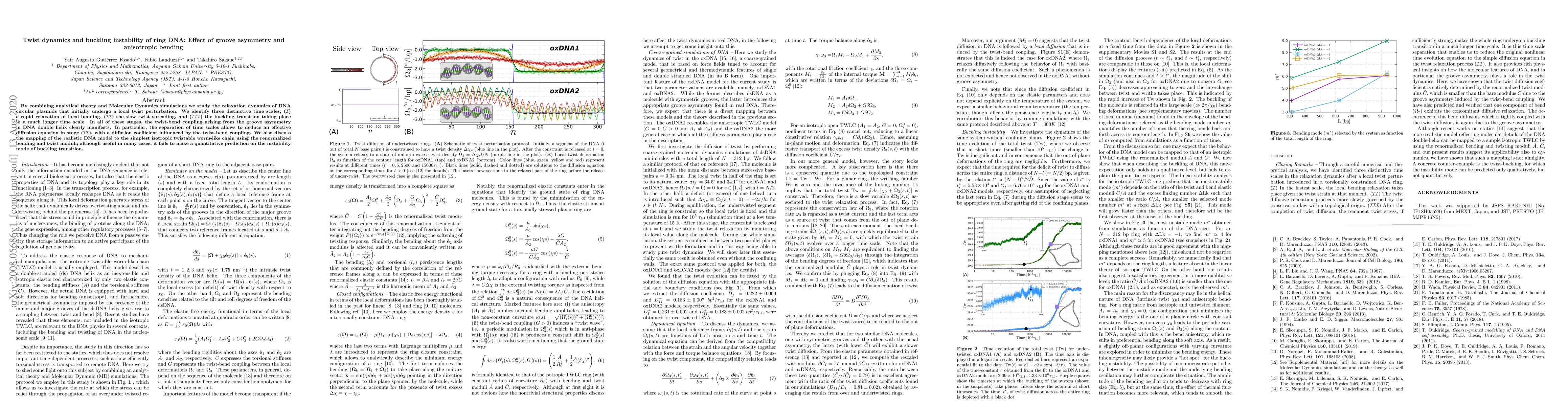 This study combines analytical theory and simulations to explore the relaxation dynamics of twisted ring DNA, identifying three distinct time scales. The groove asymmetry and anisotropic bending influence the twist-bend coupling, leading to a deduced effective diffusion equation for twist spreading, though the simplest model fails to predict buckling instability quantitatively.